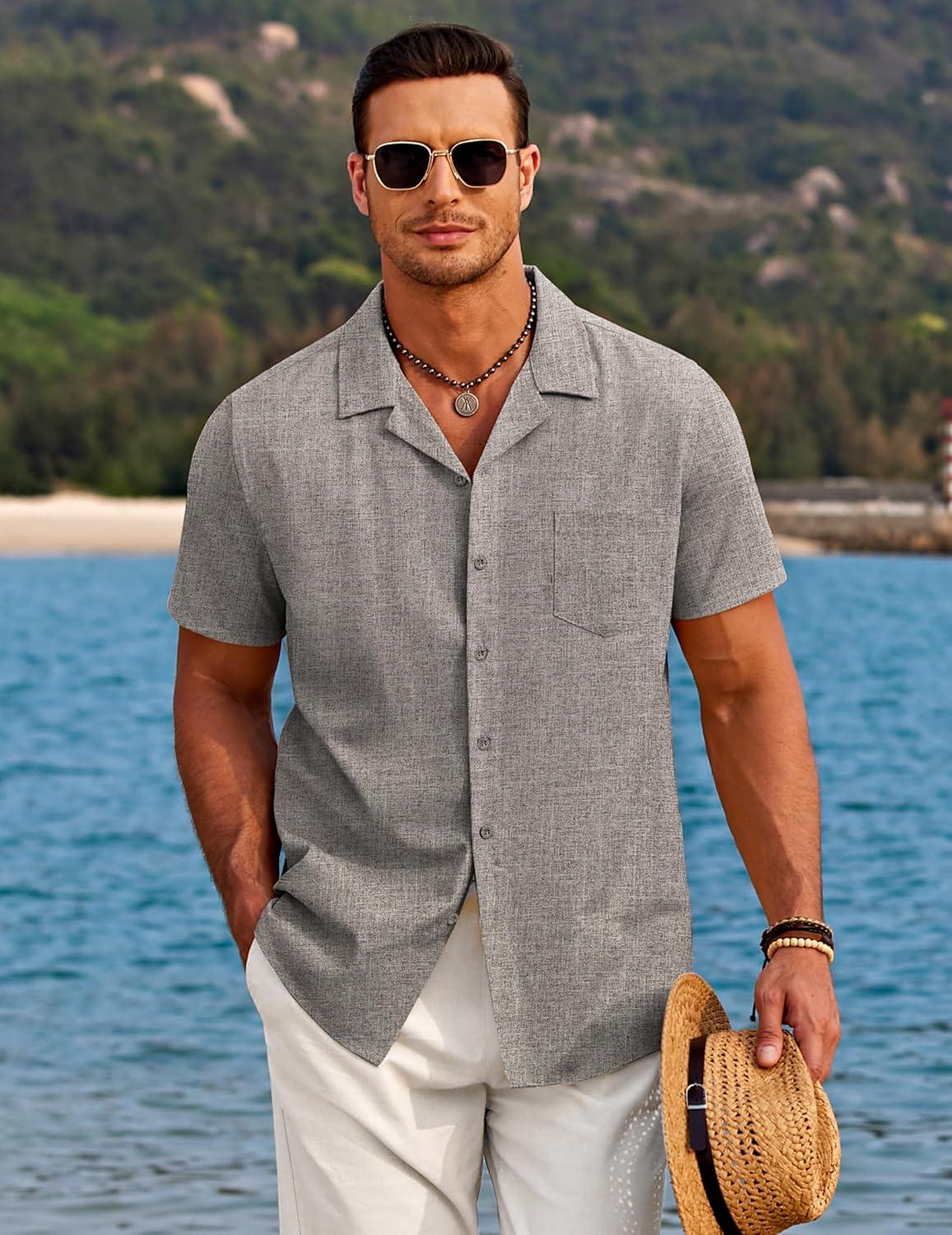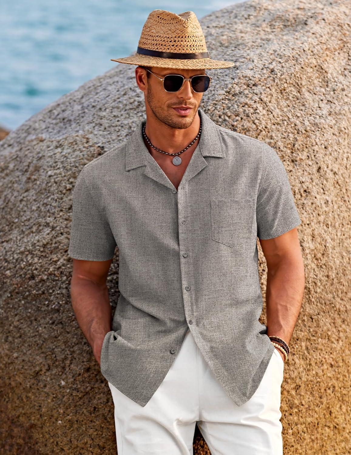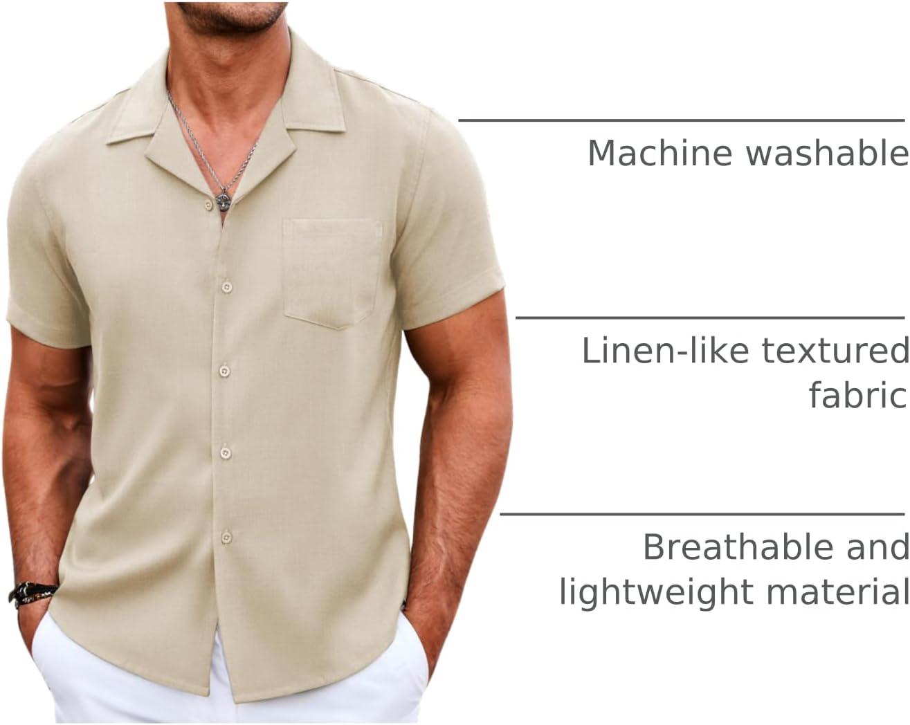 COOFANDY Men’s Casual Button Down Shirts Short Sleeve Summer Beach Shirt Cuban Vacation Textured Shirts with Pocket(Brown)