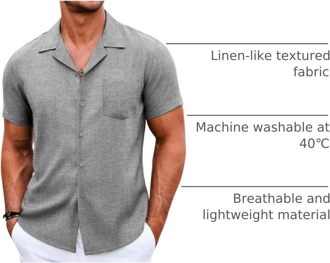 COOFANDY Men’s Casual Button Down Shirts Short Sleeve Summer Beach Shirt Cuban Vacation Textured Shirts with Pocket(Light Grey)