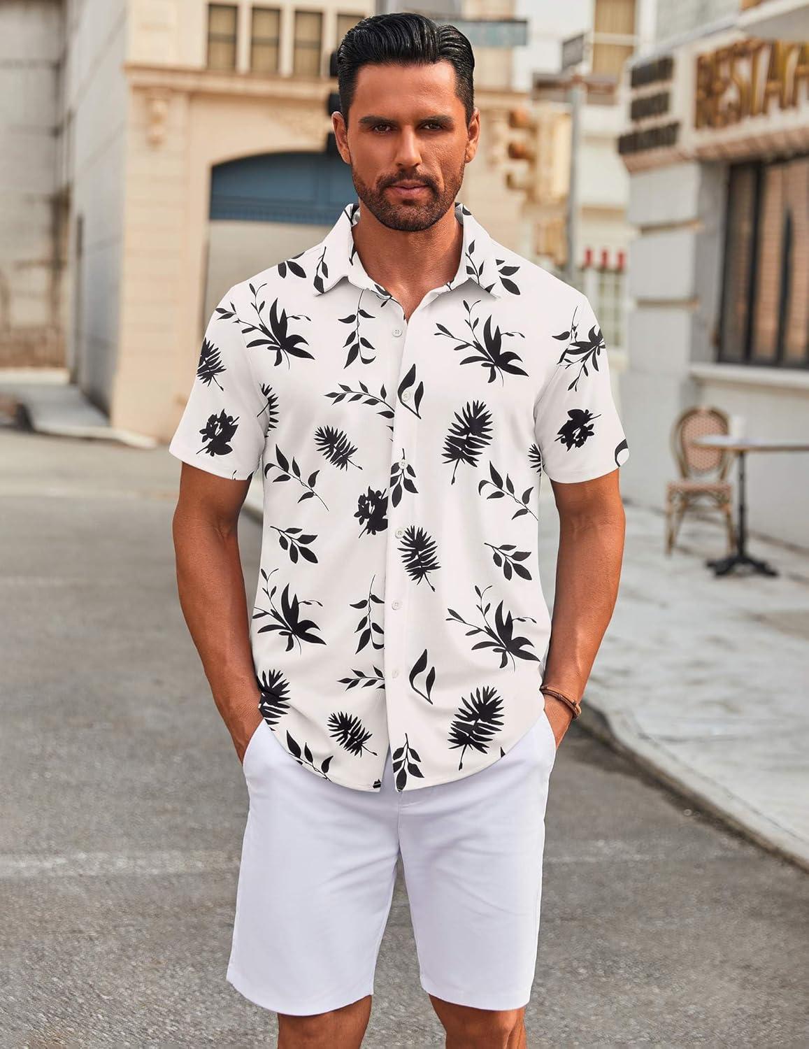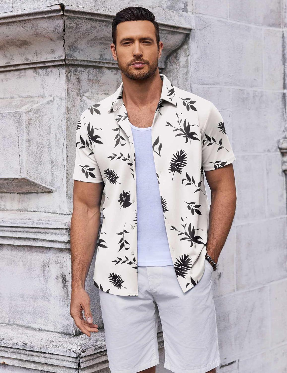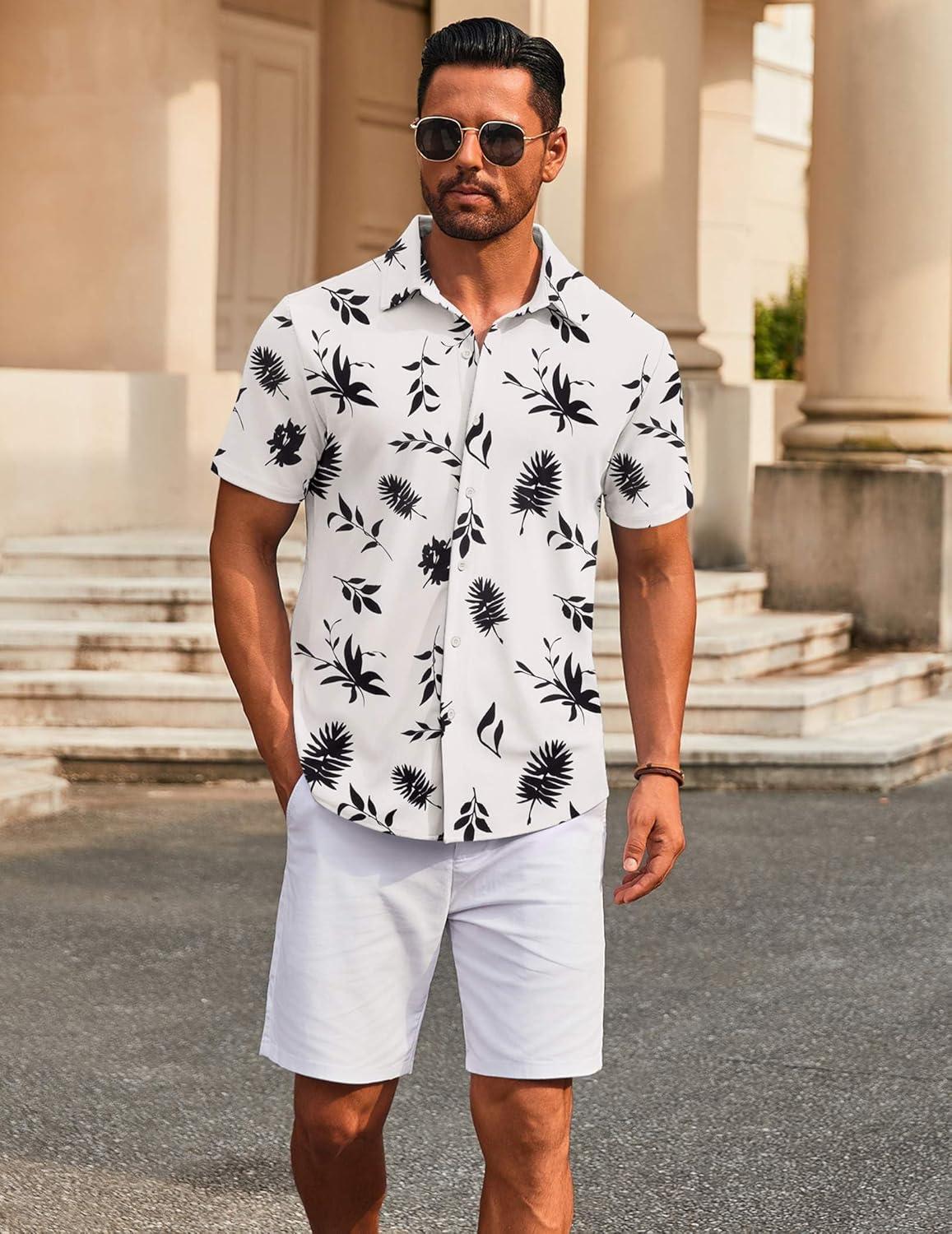 COOFANDY Men’s Casual Button Down Short Sleeve Shirts Untucked Wrinkle Free Shirt Stretch Dress Shirts(White – Leaf)