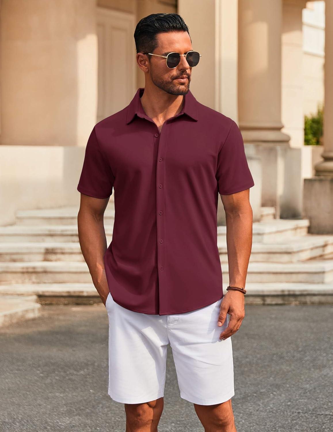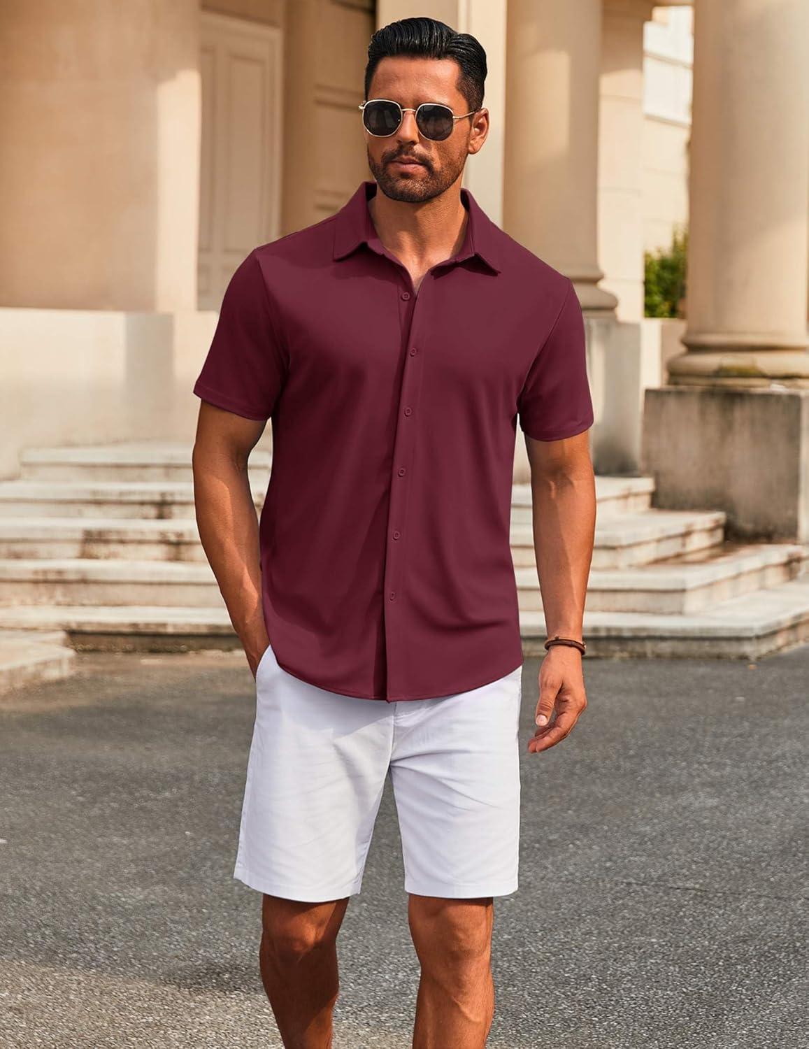COOFANDY Men’s Casual Button Down Short Sleeve Shirts Untucked Wrinkle Free Shirt Stretch Dress Shirts(Wine Red)