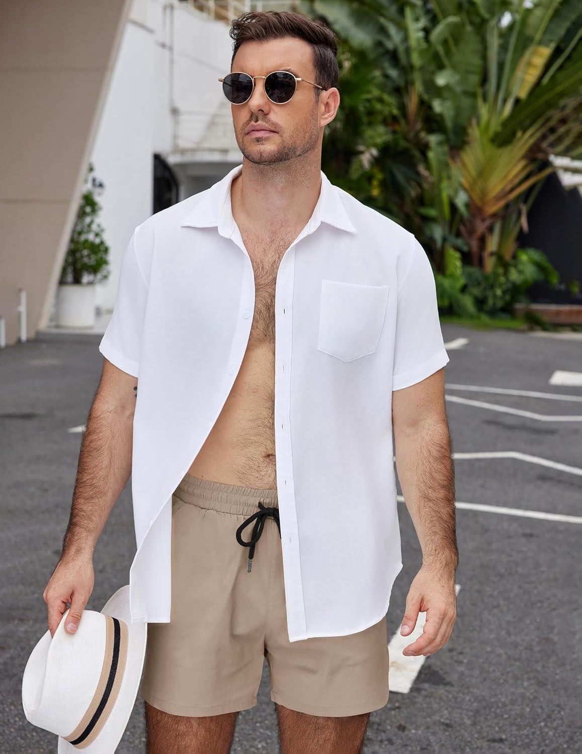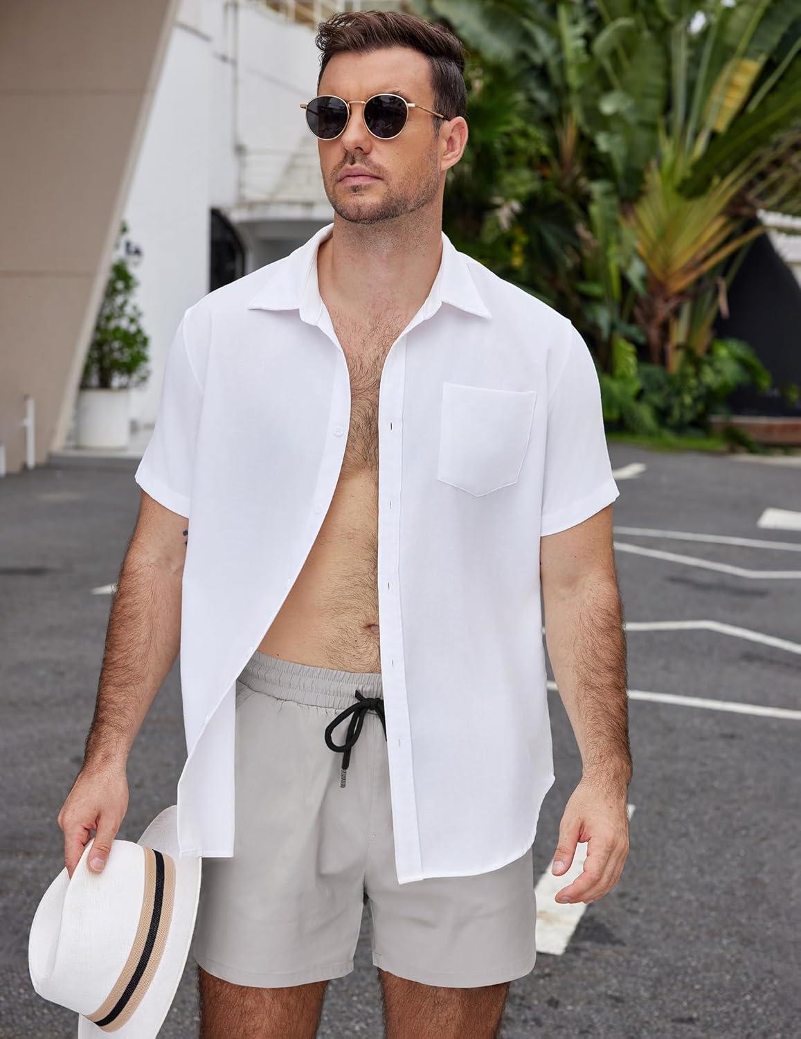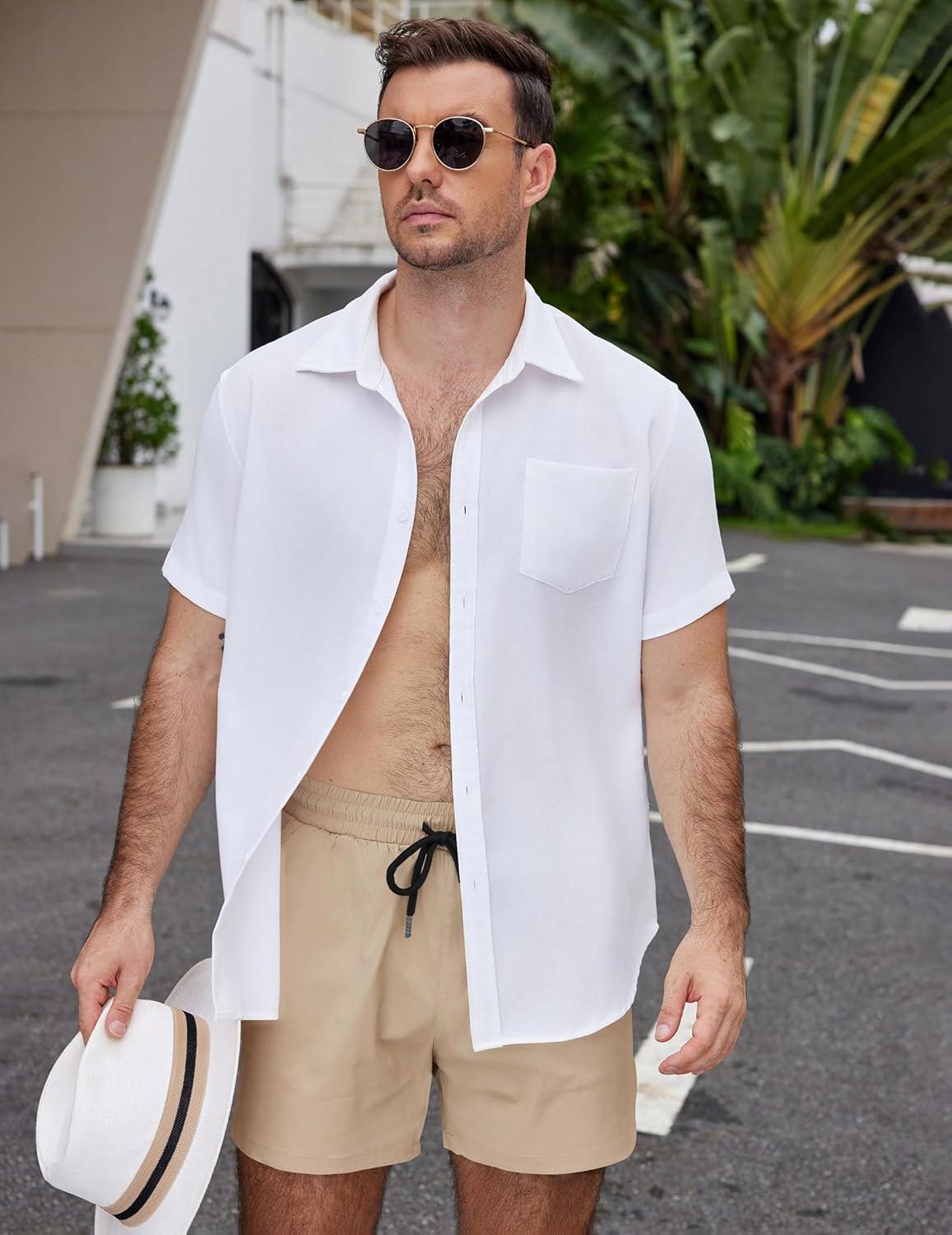 COOFANDY Men’s Casual Button Down Shirts Short Sleeve Summer Beach Vacation Untucked Dress Shirts with Pocket(White)