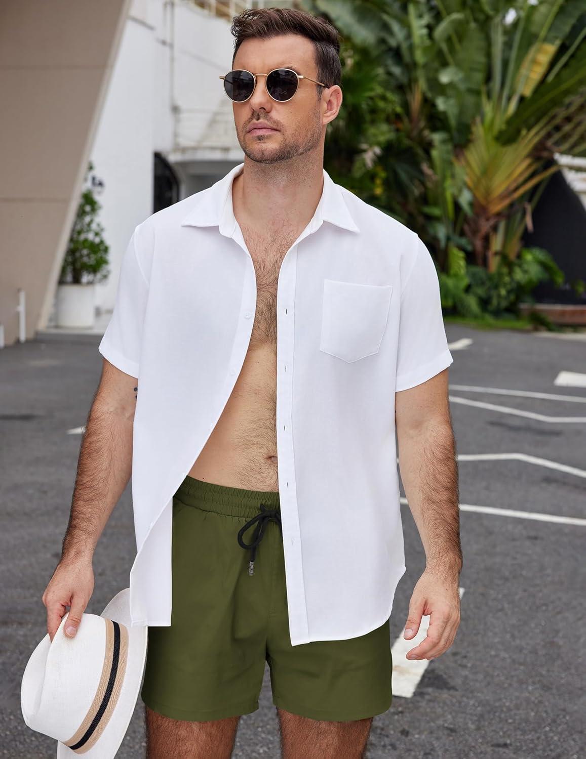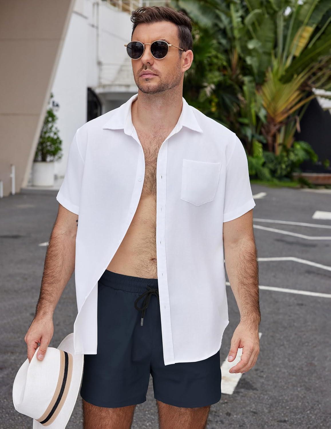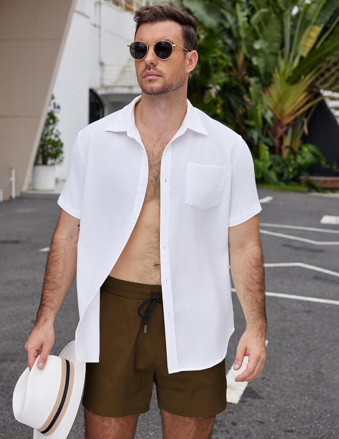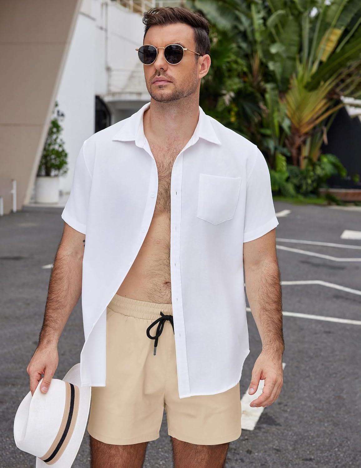 COOFANDY Men’s Casual Button Down Shirts Short Sleeve Summer Beach Vacation Untucked Dress Shirts with Pocket(White)