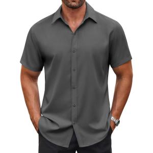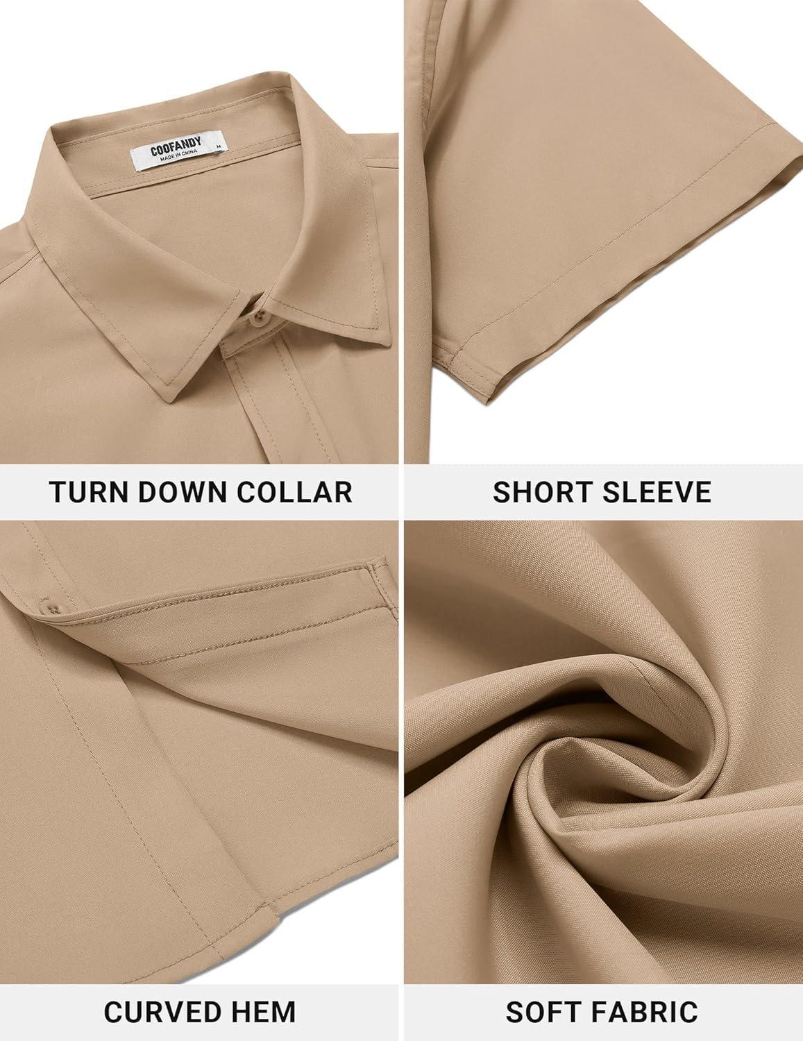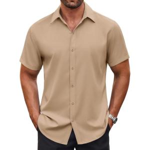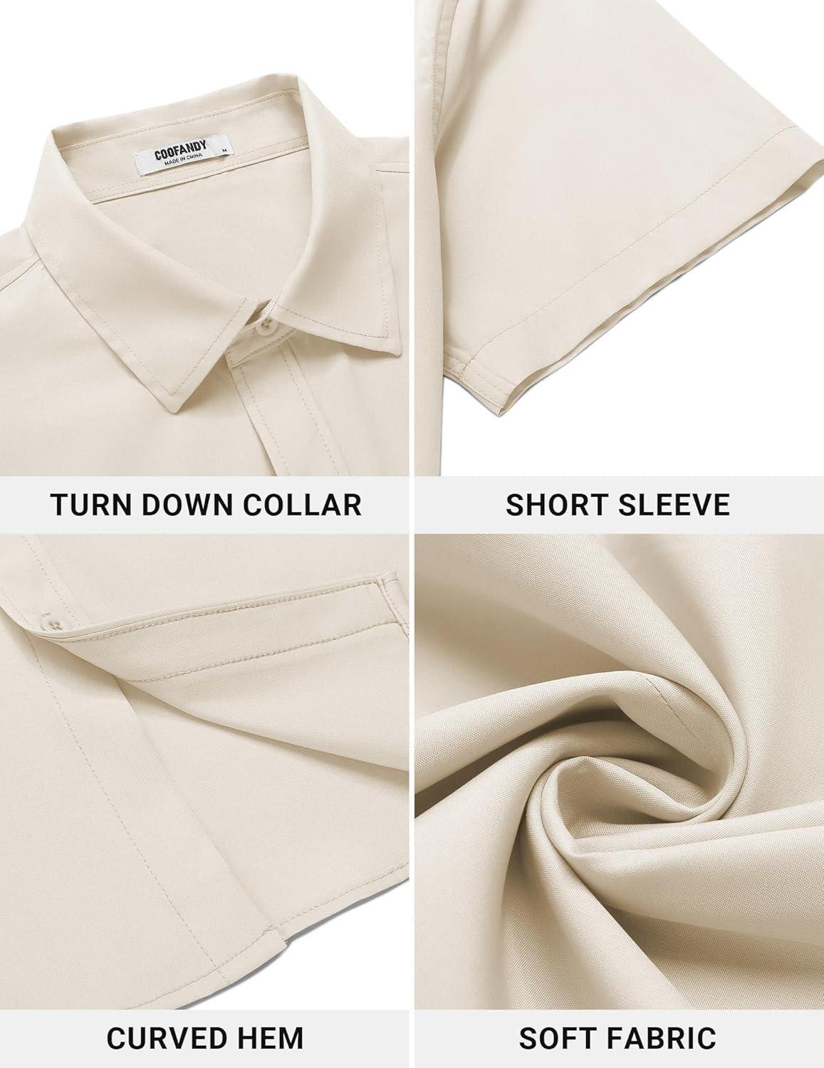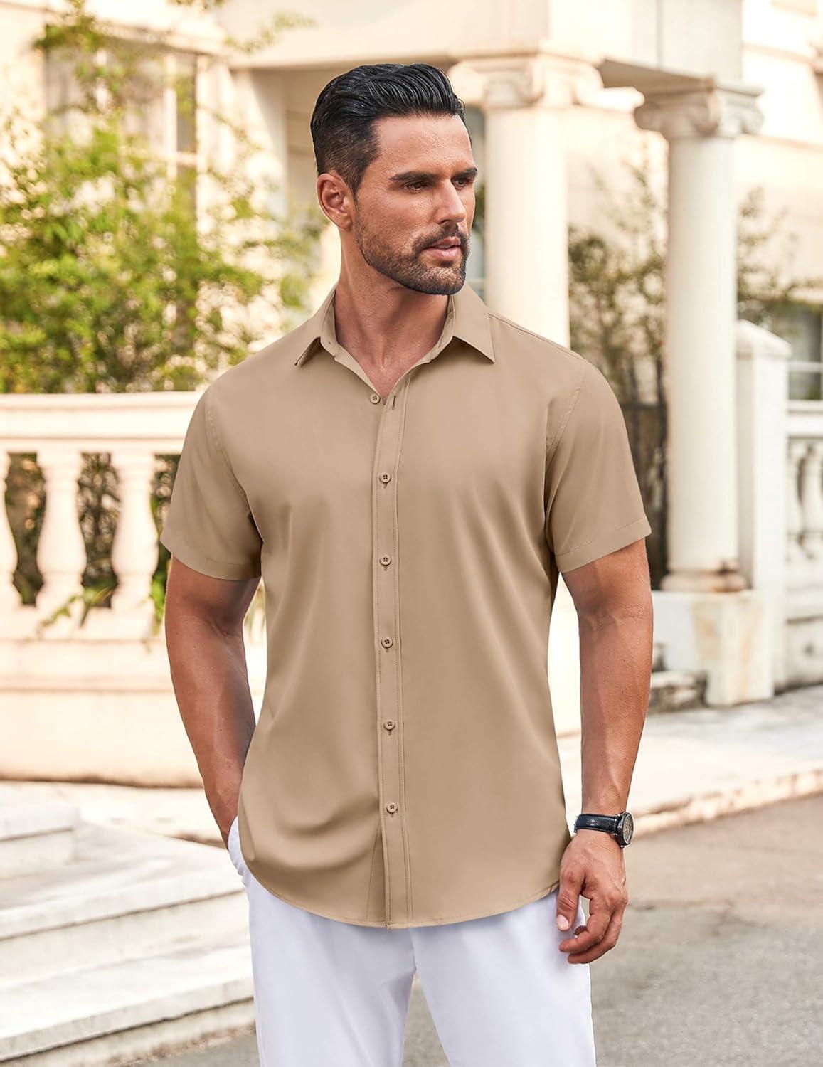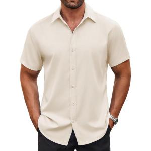 • COOFANDY Men’s Button Down Shirt Short Sleeve Dress Shirt Casual Beach Summer Wedding Shirt(Beige)