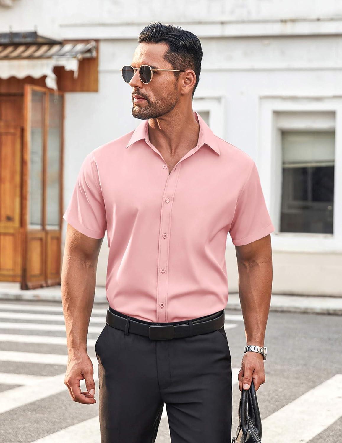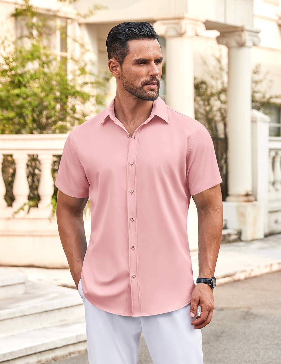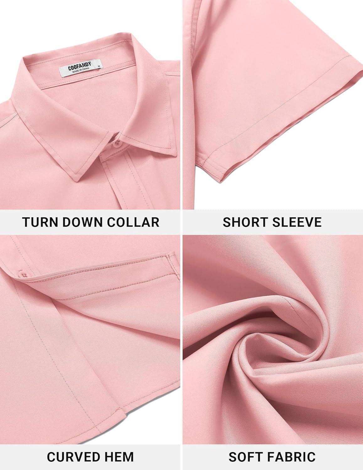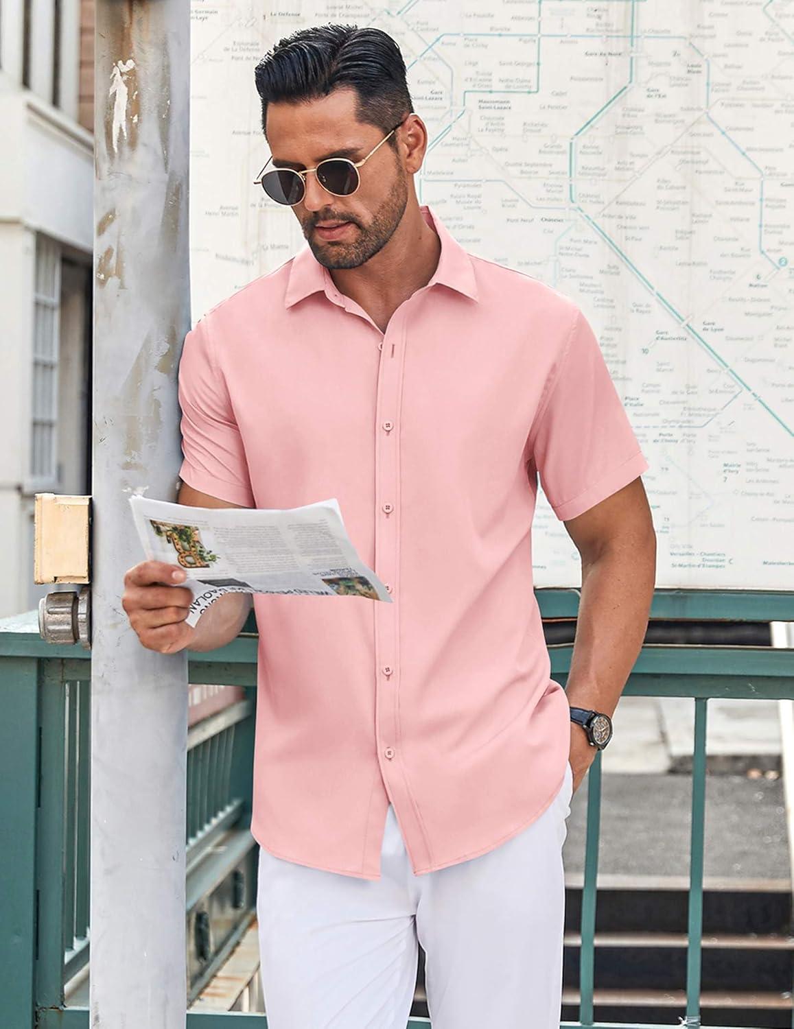 • COOFANDY Men’s Button Down Shirt Short Sleeve Casual Shirt for Men Summer Business Casual Dress Shirt(Pink)