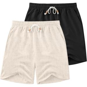 COOFANDY Mens Linen Shorts Casual Drawstring Elastic Waist Lightweight Summer Vacation Beach Shorts(Light Khaki / Black)