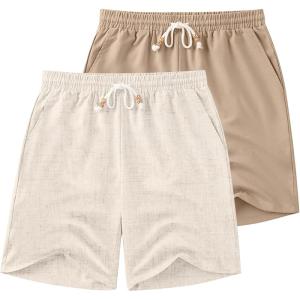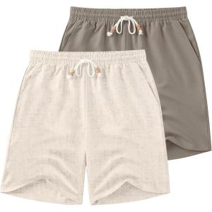 COOFANDY Mens Linen Shorts Casual Drawstring Elastic Waist Lightweight Summer Vacation Beach Shorts(Light Khaki / Dark Grey)