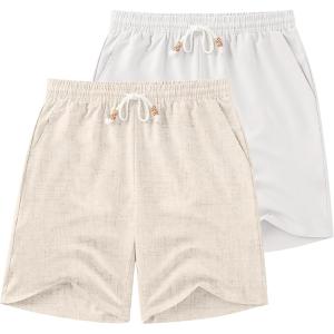 COOFANDY Mens Linen Shorts Casual Drawstring Elastic Waist Lightweight Summer Vacation Beach Shorts(Light Khaki / White)