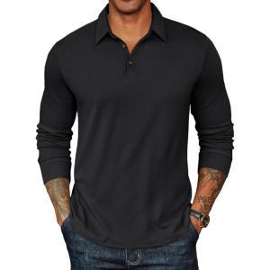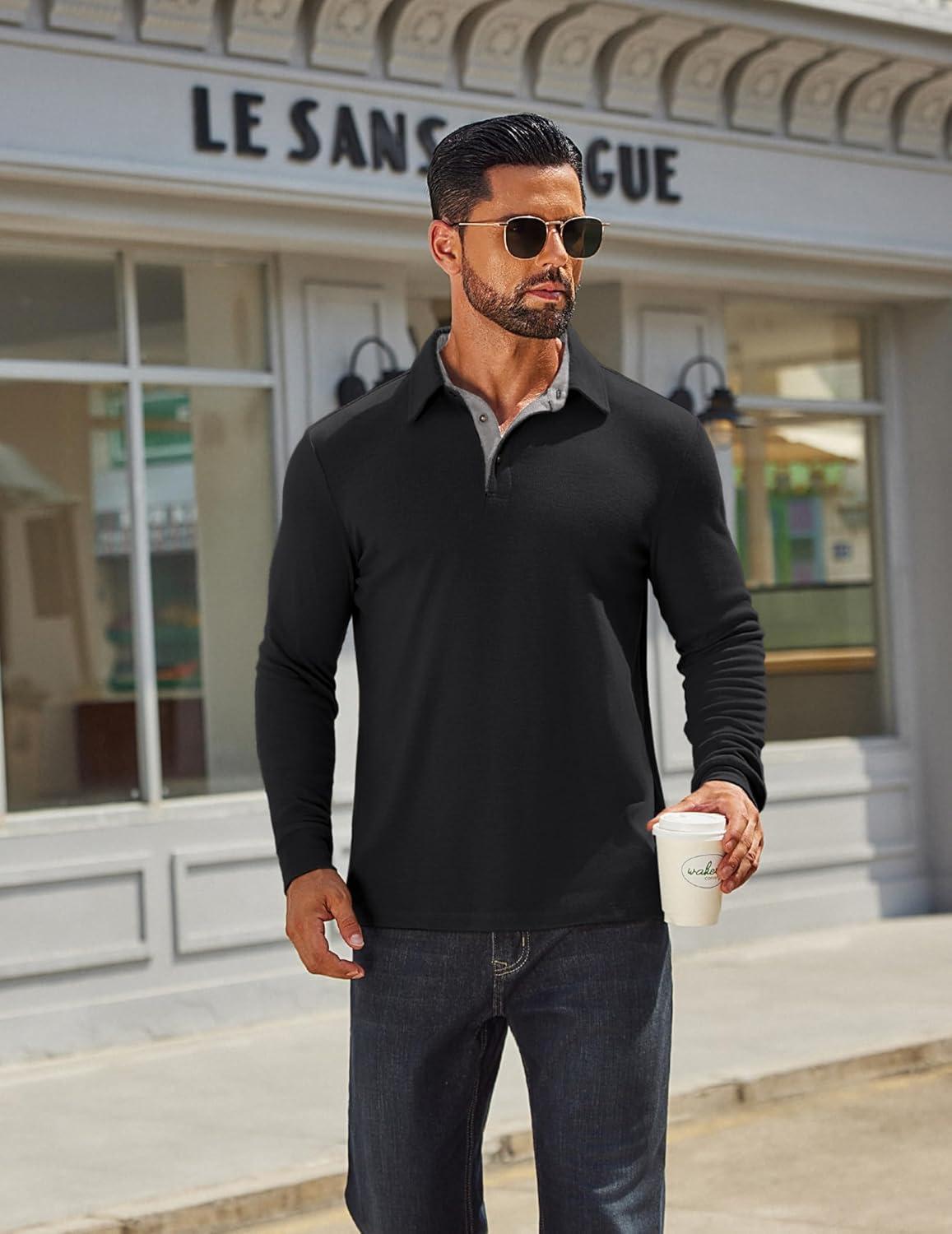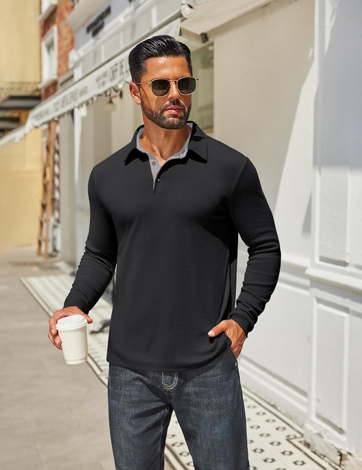 COOFANDY Mens Long Sleeve Polo Shirts Classic Casual Button Polo Tee Lightweight Collared Golf Shirt(02-black)