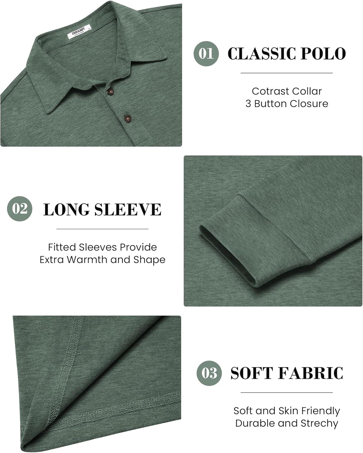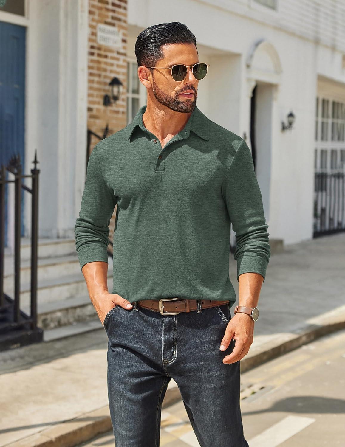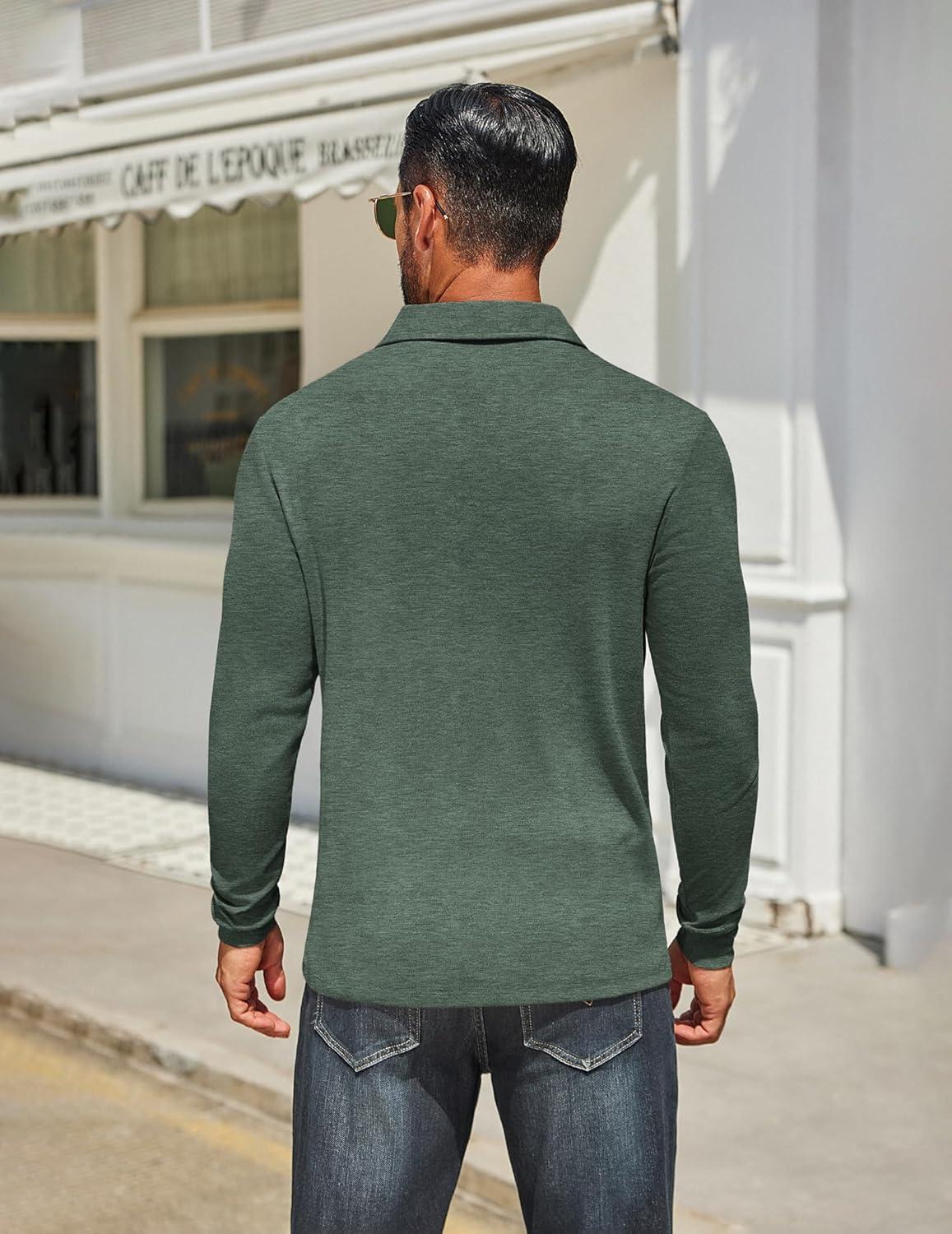 COOFANDY Mens Long Sleeve Polo Shirts Classic Casual Button Polo Tee Lightweight Collared Golf Shirt(Dark Army Green)