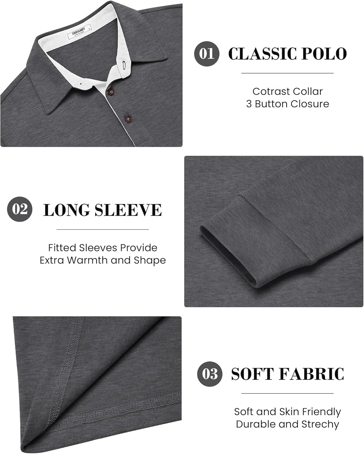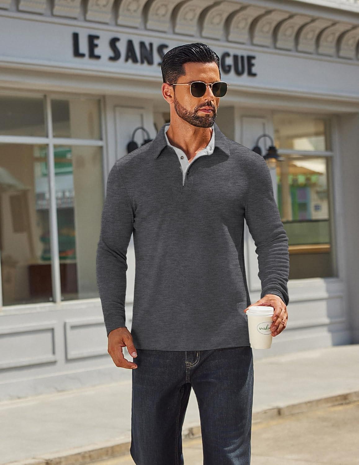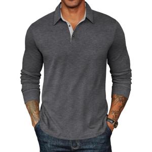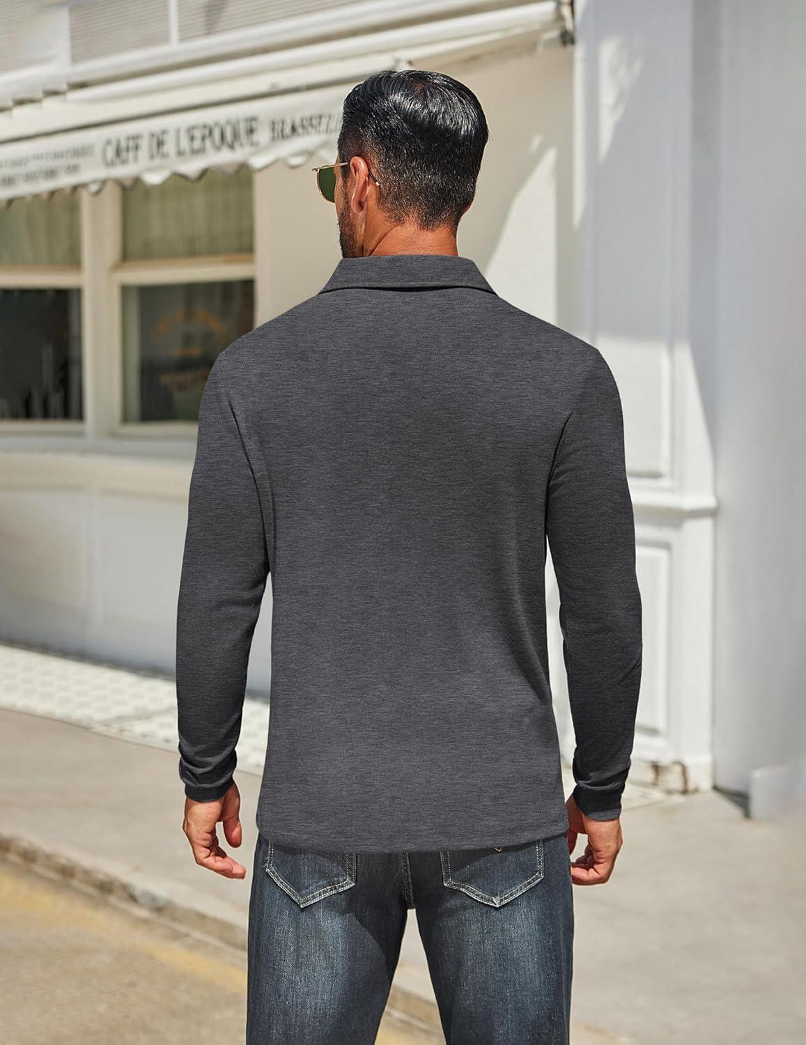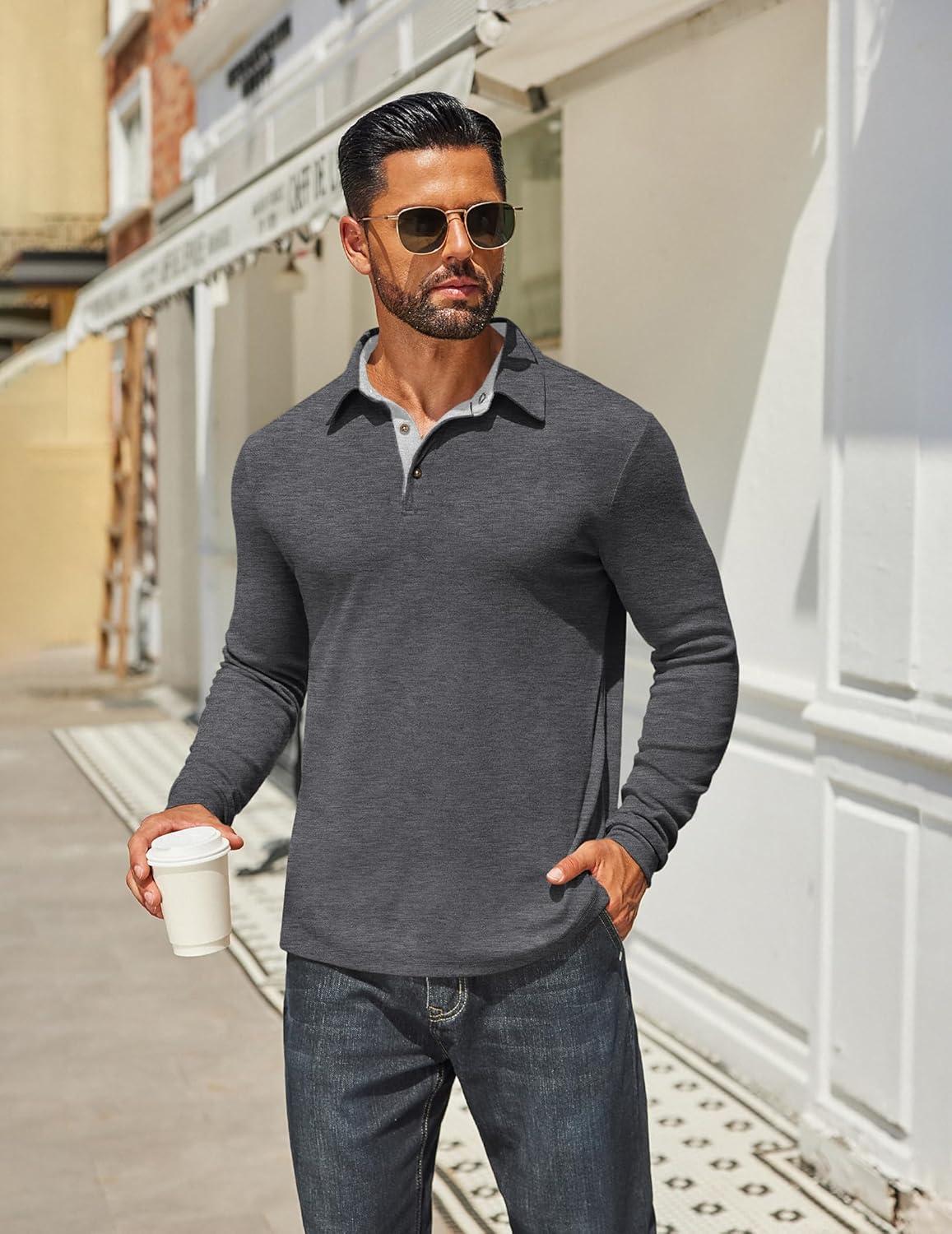 COOFANDY Mens Long Sleeve Polo Shirts Classic Casual Button Polo Tee Lightweight Collared Golf Shirt(Dark Grey)