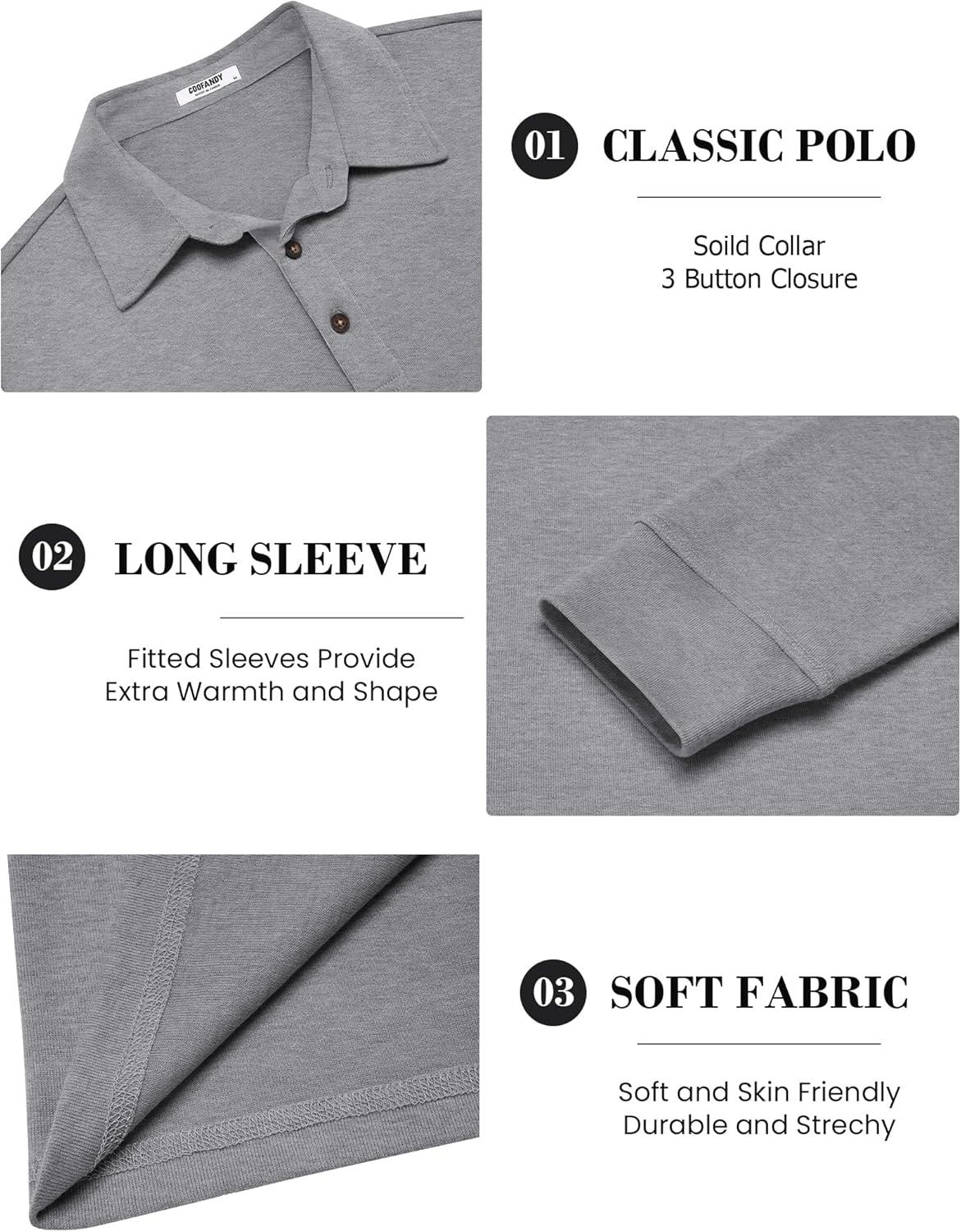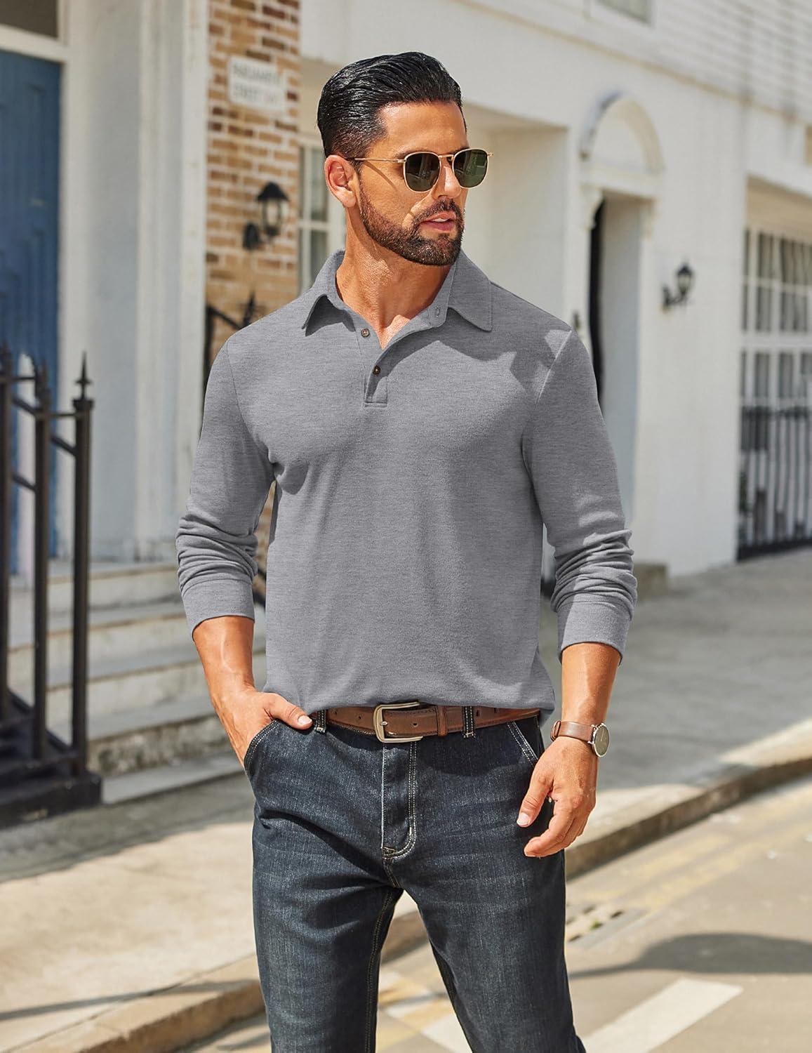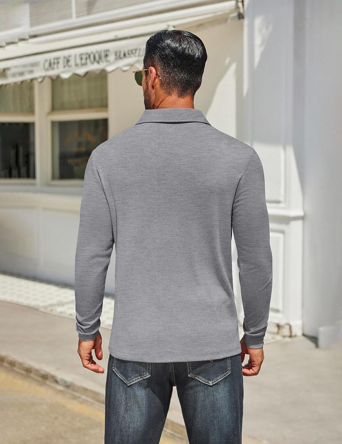 COOFANDY Mens Long Sleeve Polo Shirts Classic Casual Button Polo Tee Lightweight Collared Golf Shirt(Grey)