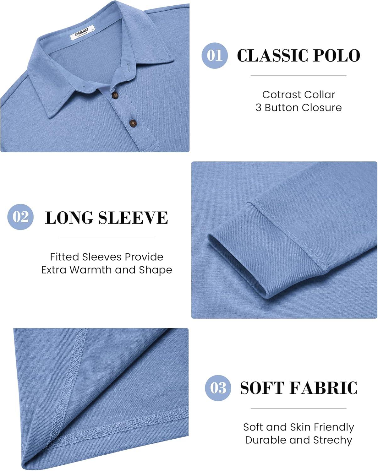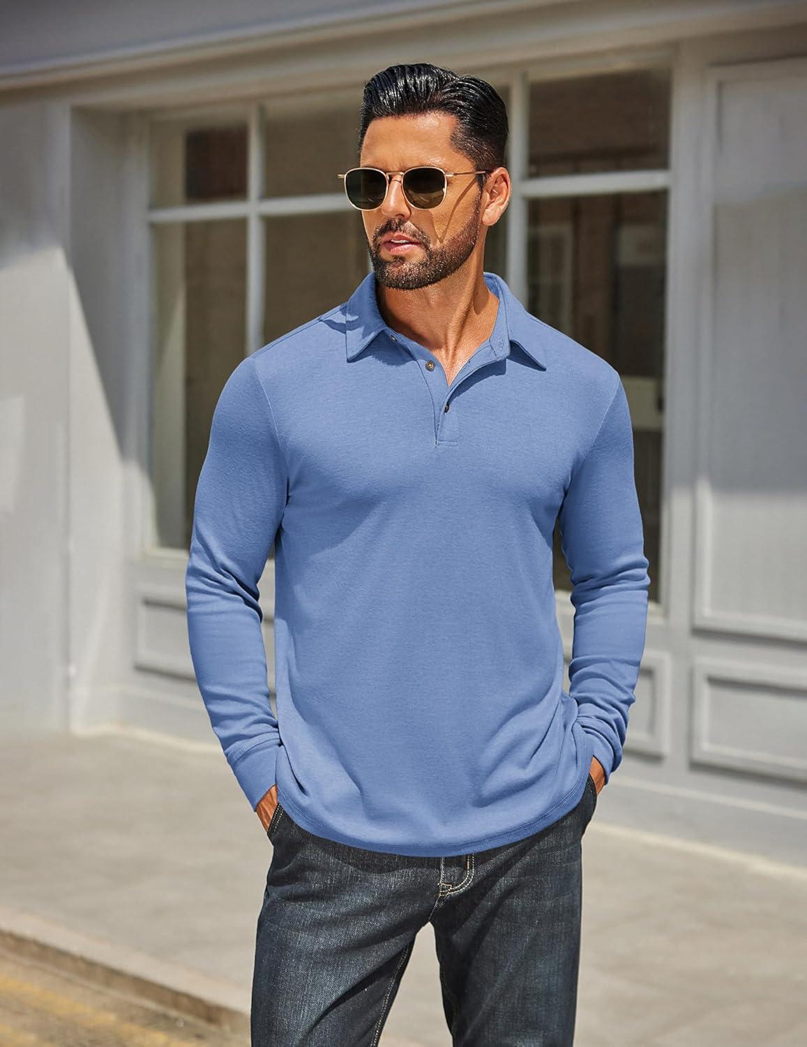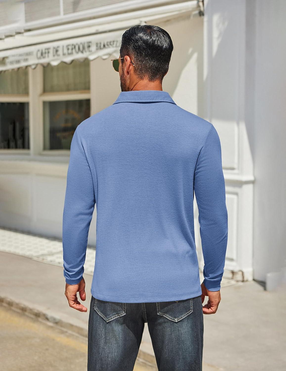 COOFANDY Mens Long Sleeve Polo Shirts Classic Casual Button Polo Tee Lightweight Collared Golf Shirt(Light Blue)