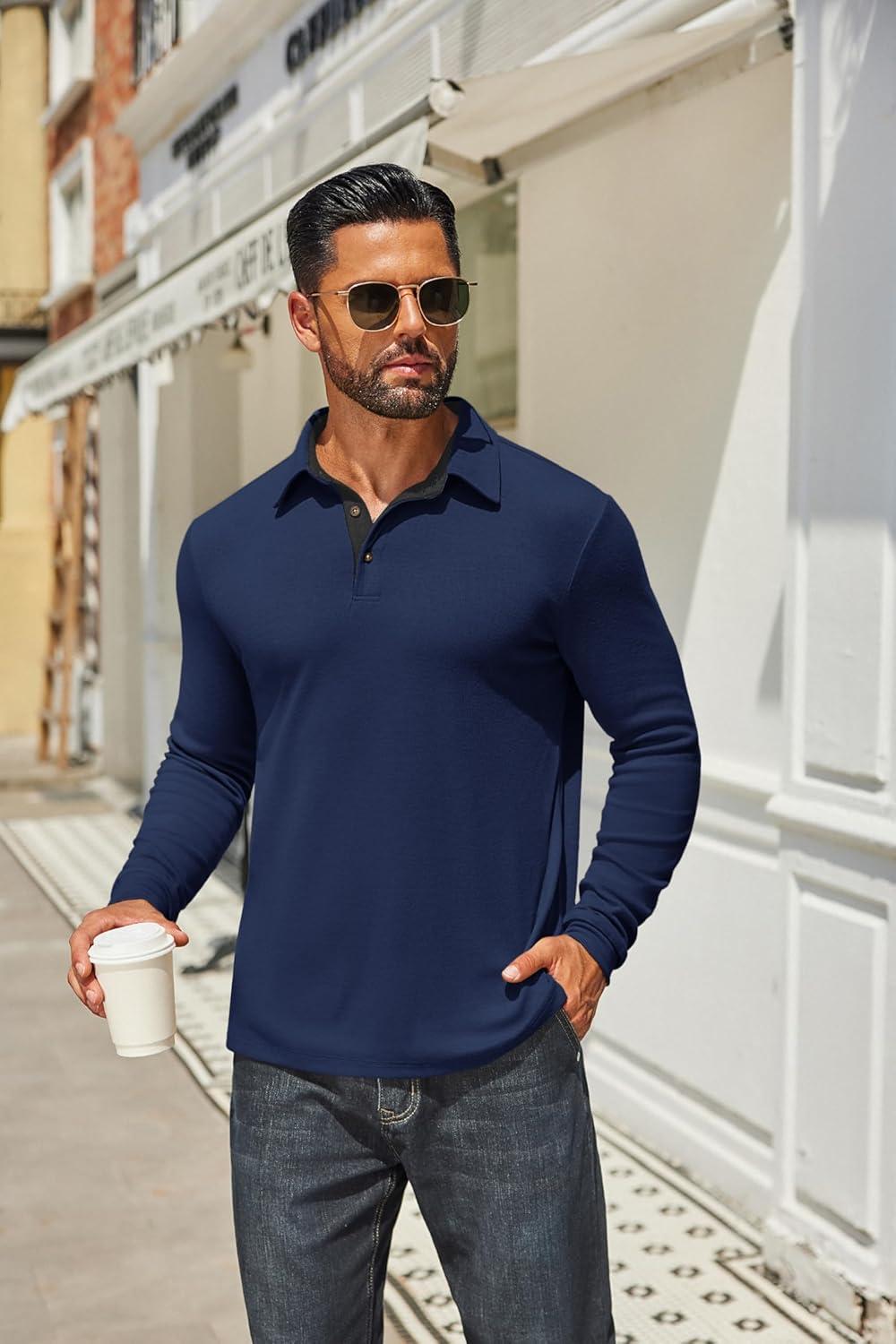 COOFANDY Mens Long Sleeve Polo Shirts Classic Casual Button Polo Tee Lightweight Collared Golf Shirt(Navy Blue)