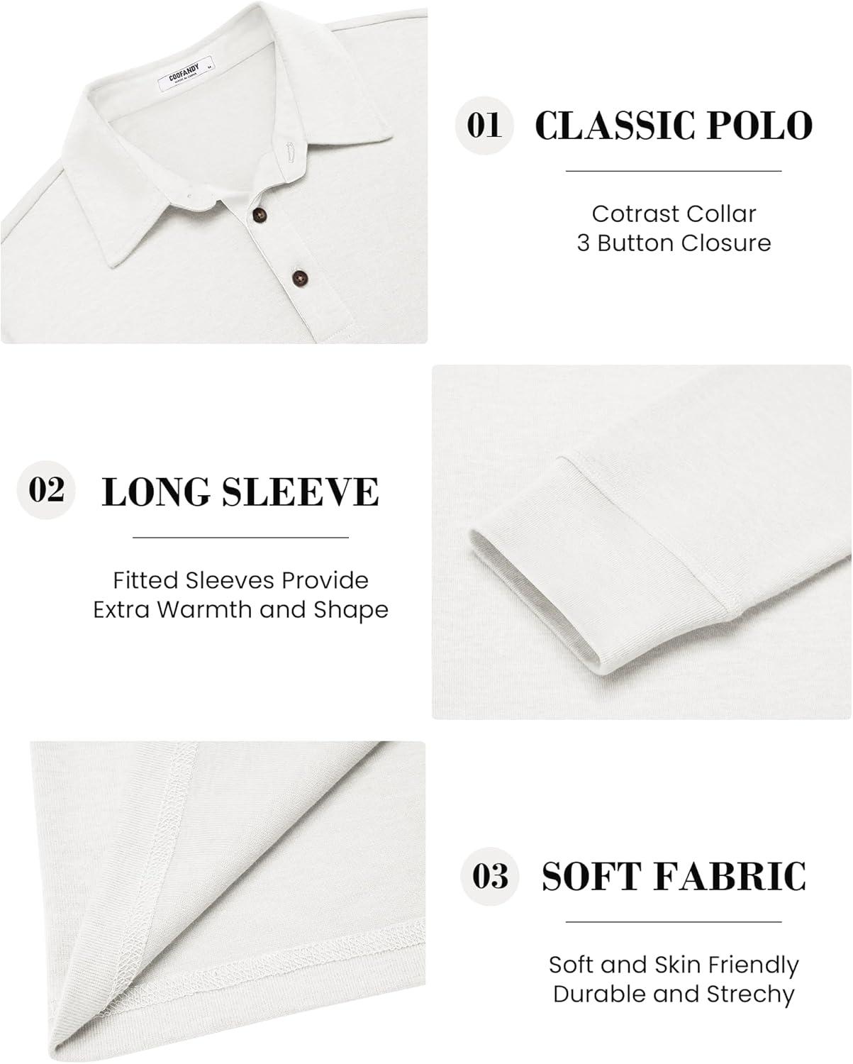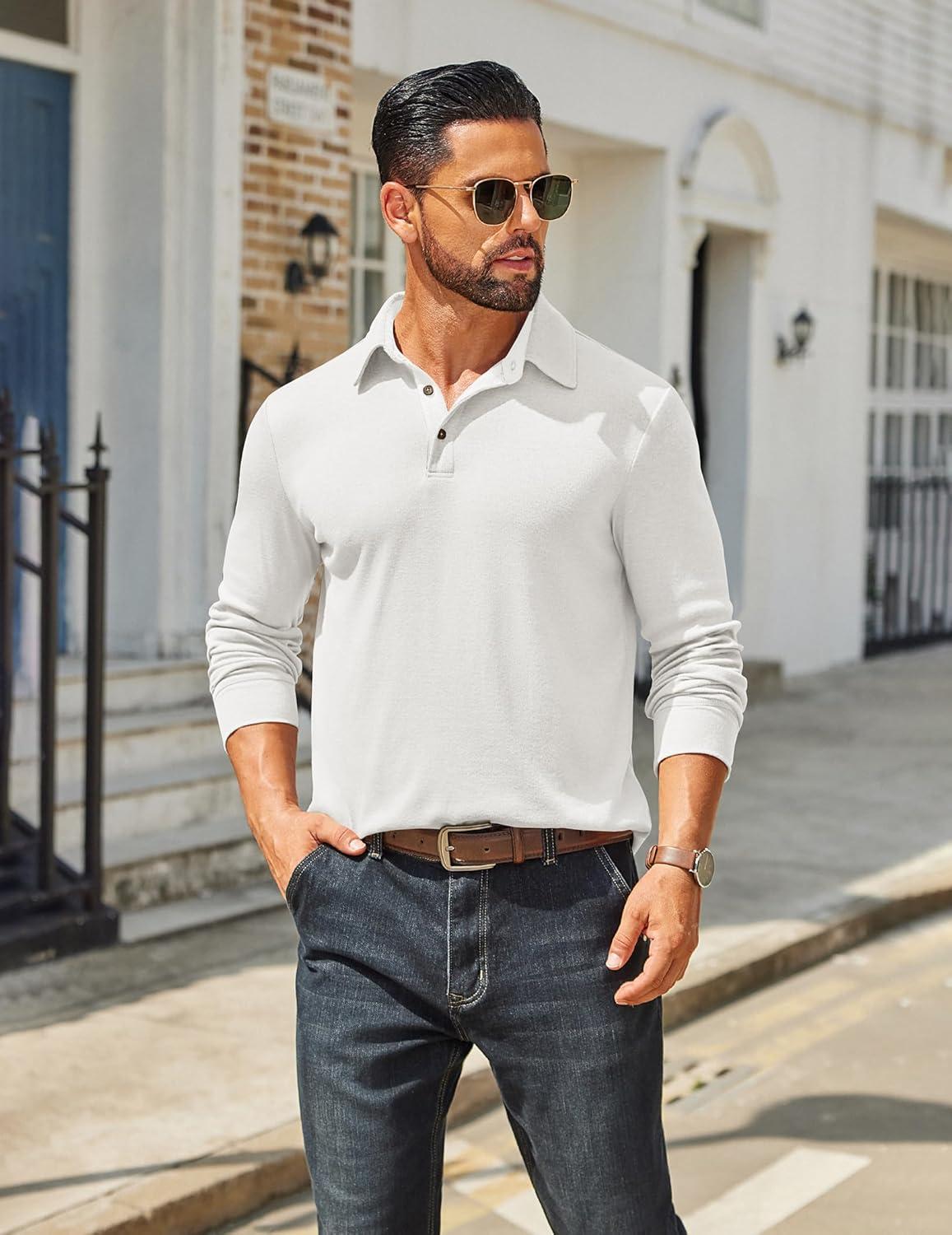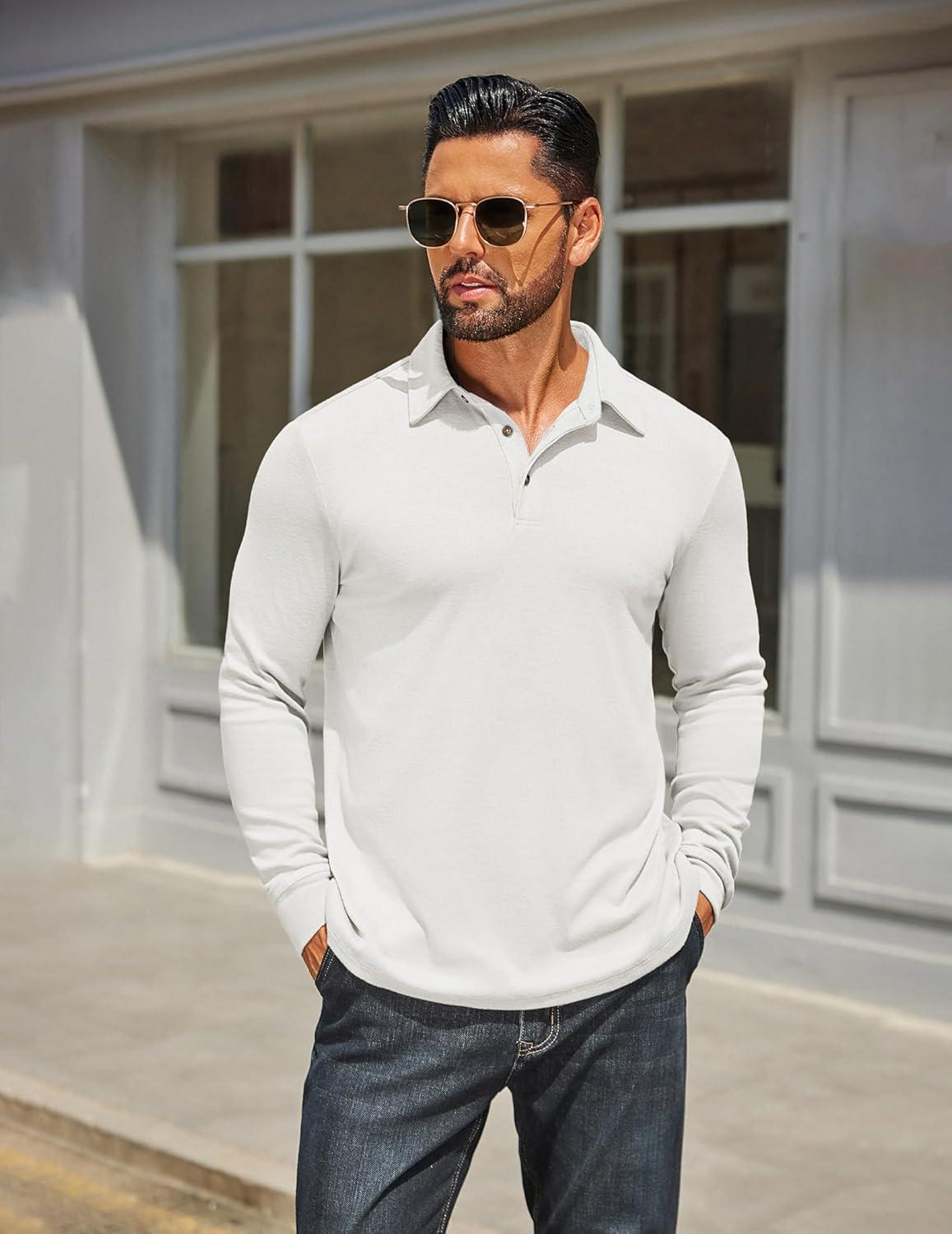 COOFANDY Mens Long Sleeve Polo Shirts Classic Casual Button Polo Tee Lightweight Collared Golf Shirt(White)