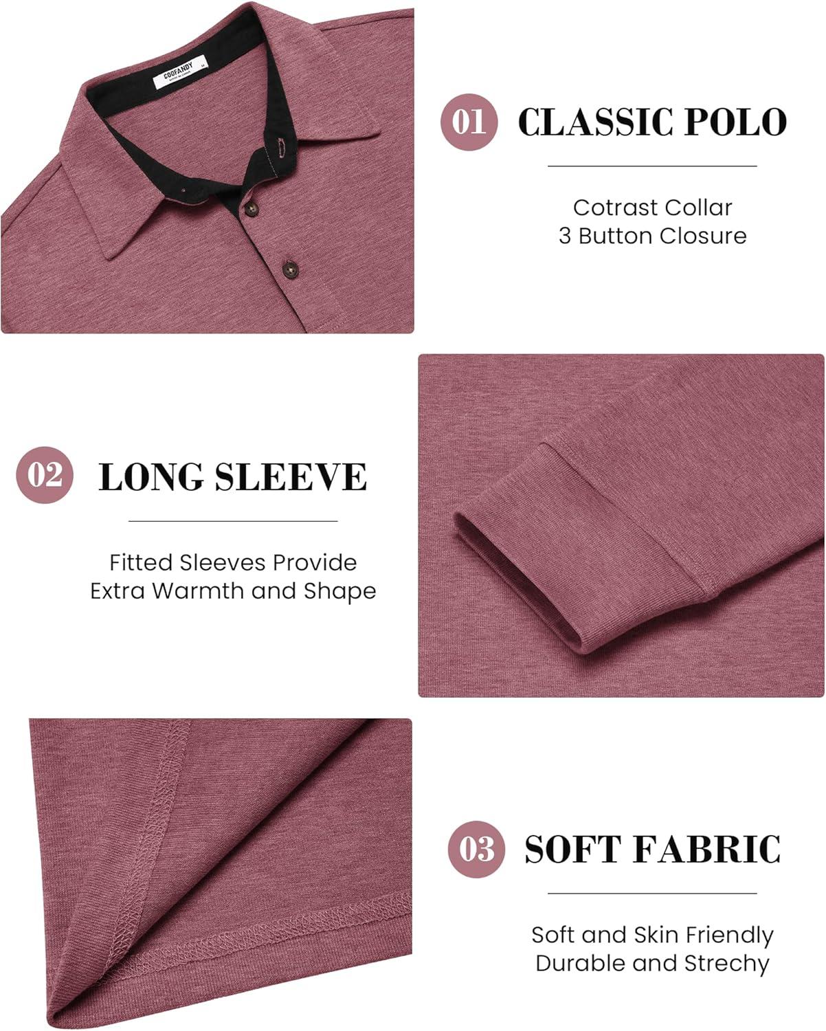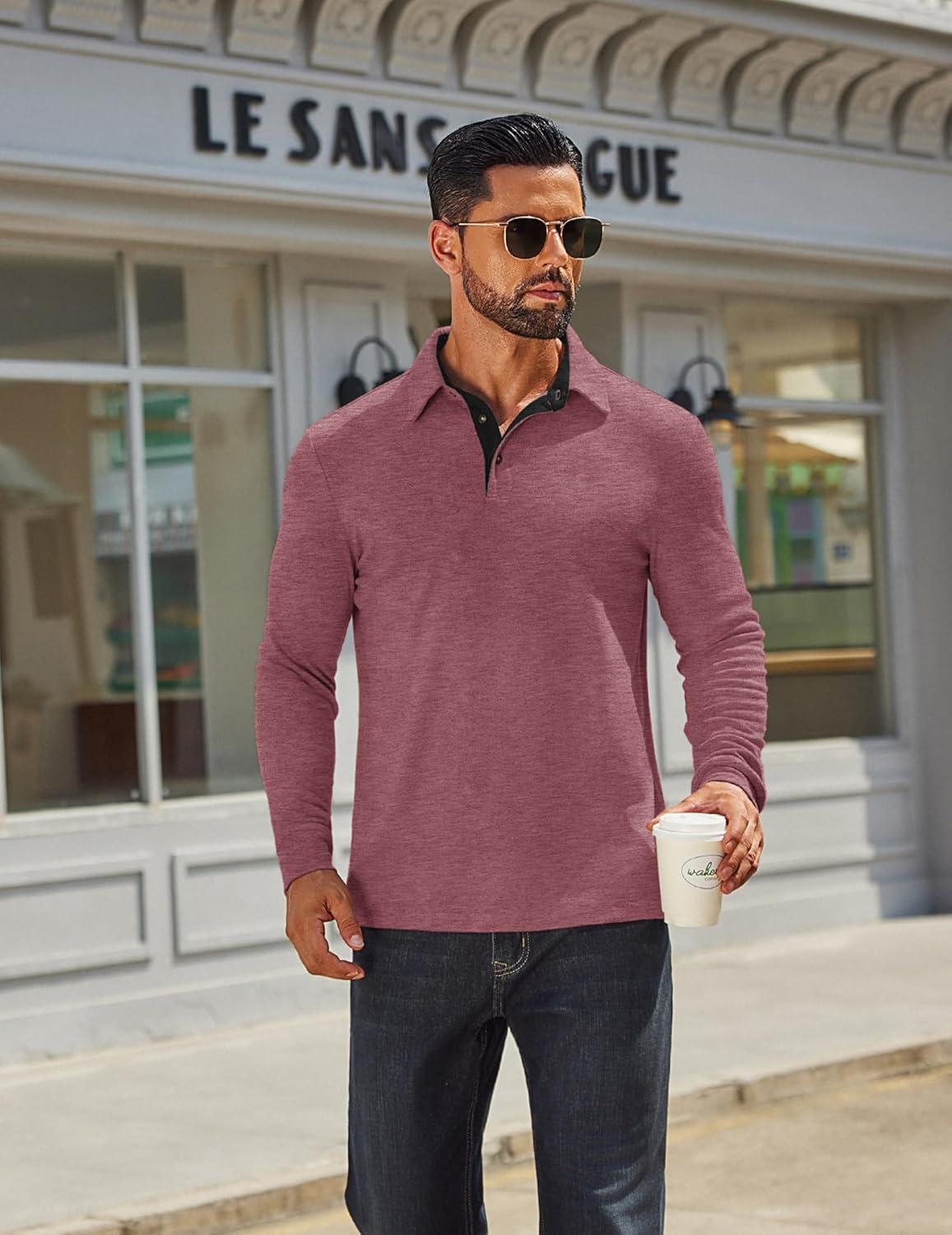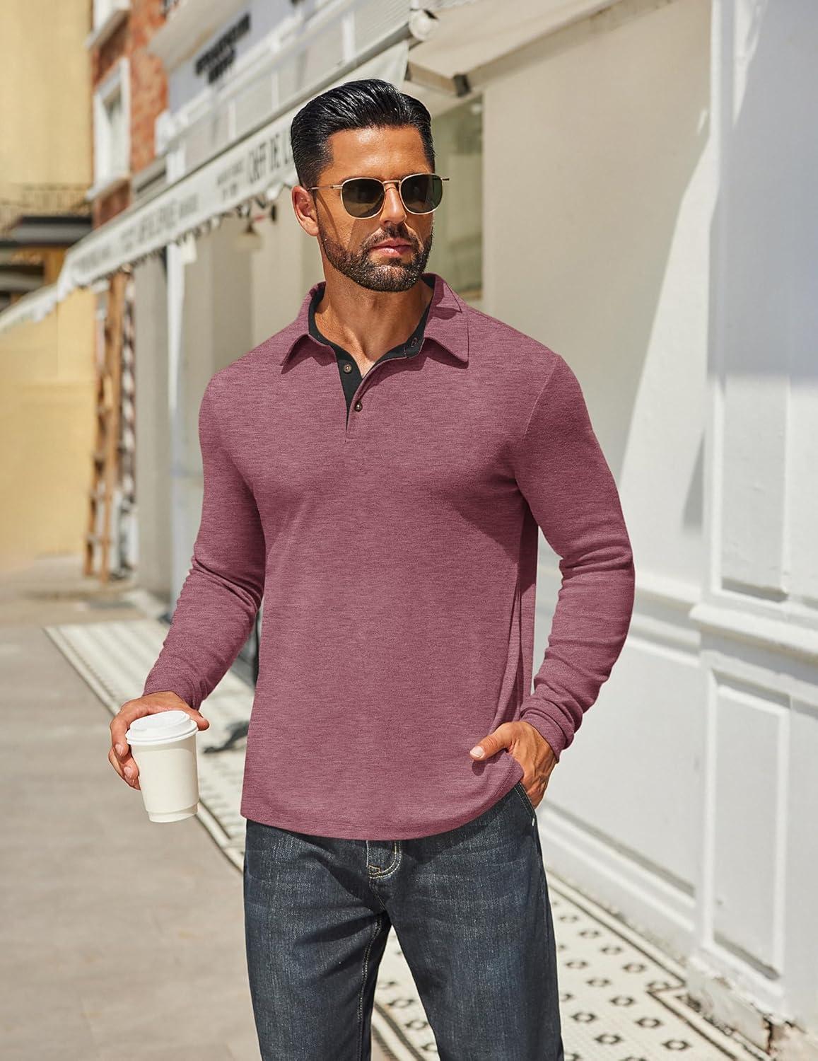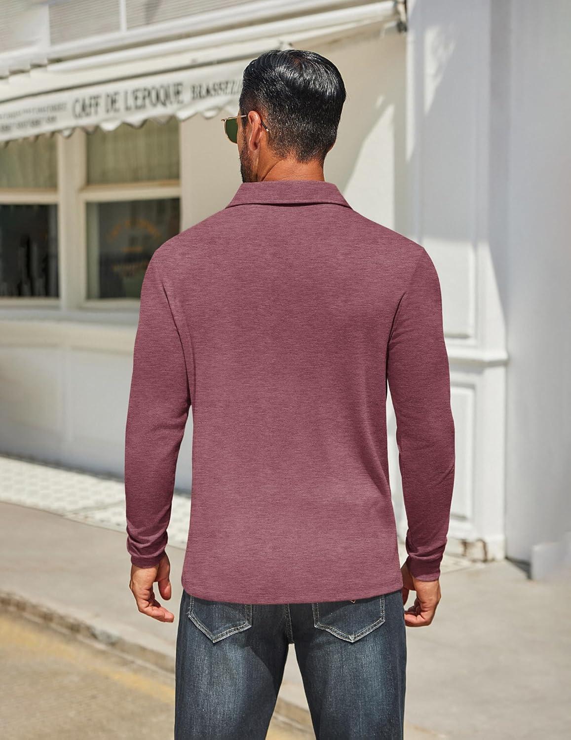 COOFANDY Mens Long Sleeve Polo Shirts Classic Casual Button Polo Tee Lightweight Collared Golf Shirt(Wine Red)