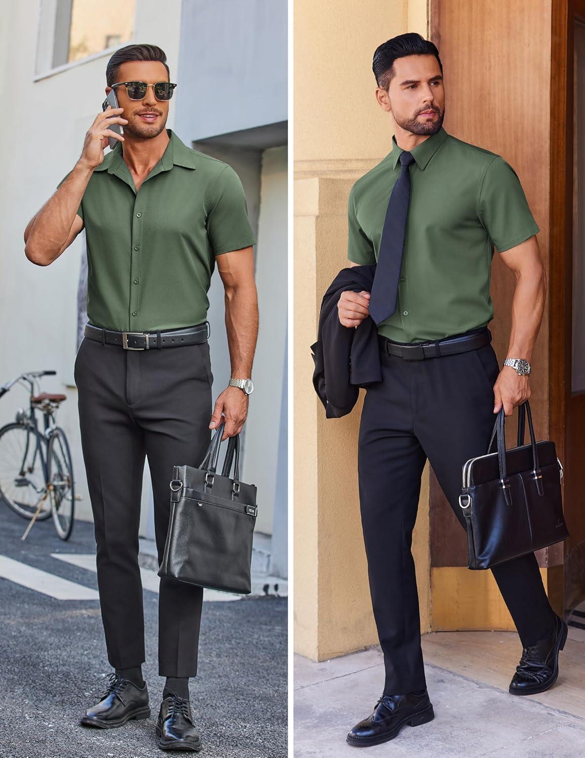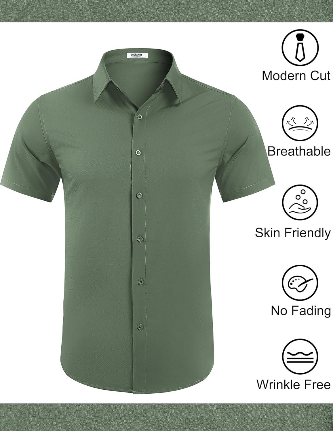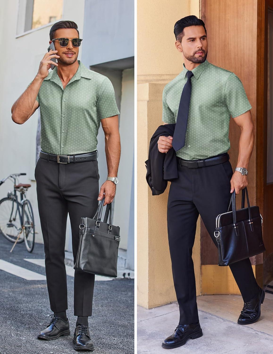 COOFANDY Mens Wrinkle Free Dress Shirt Polka Dot Short Sleeve Button Down Business Casual Shirts(Army Green)