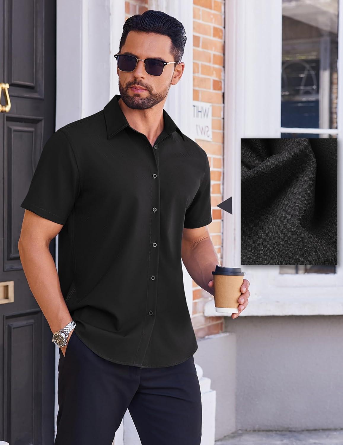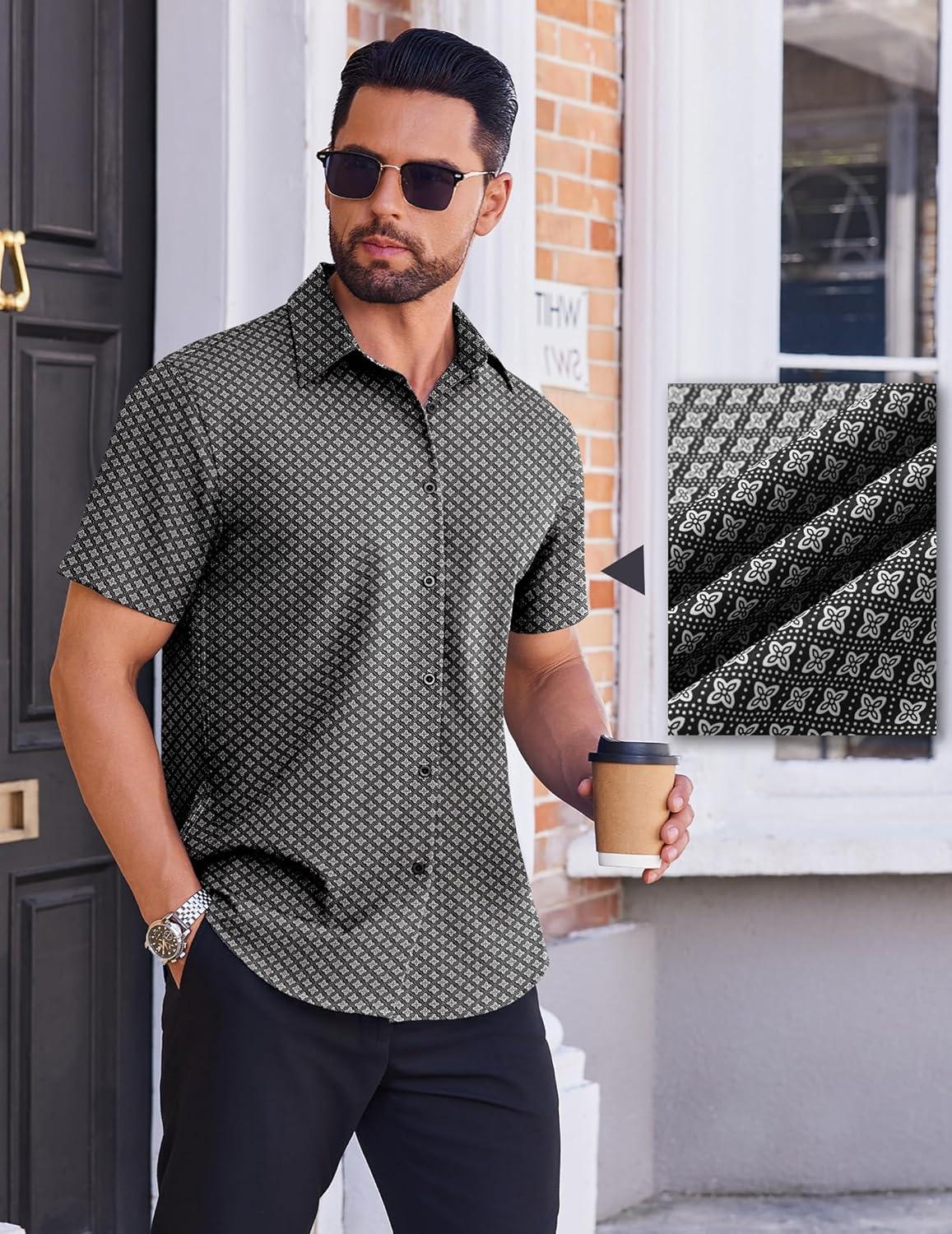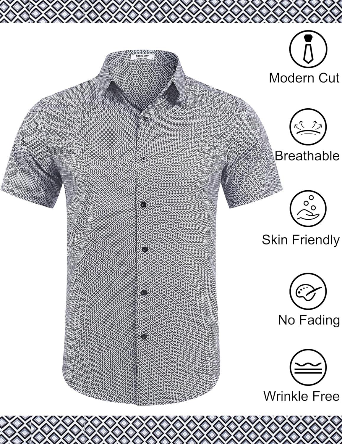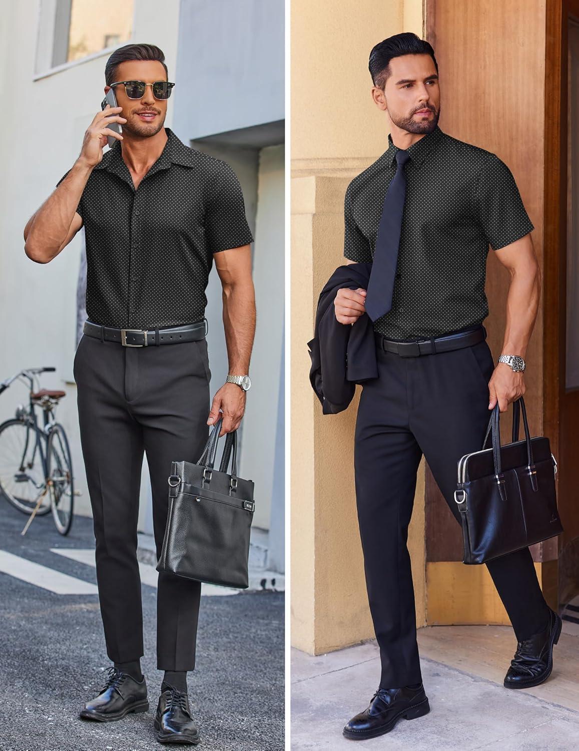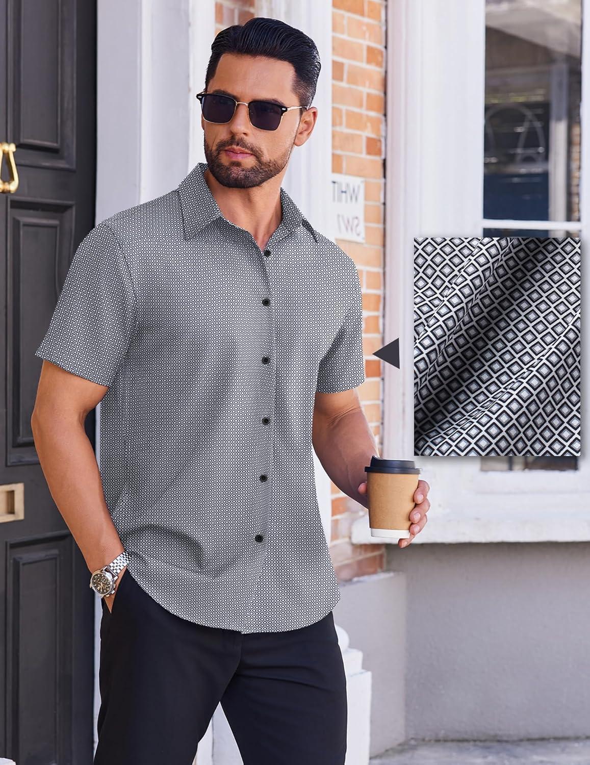 COOFANDY Mens Wrinkle Free Dress Shirt Polka Dot Short Sleeve Button Down Business Casual Shirts(Black Grey-square)
