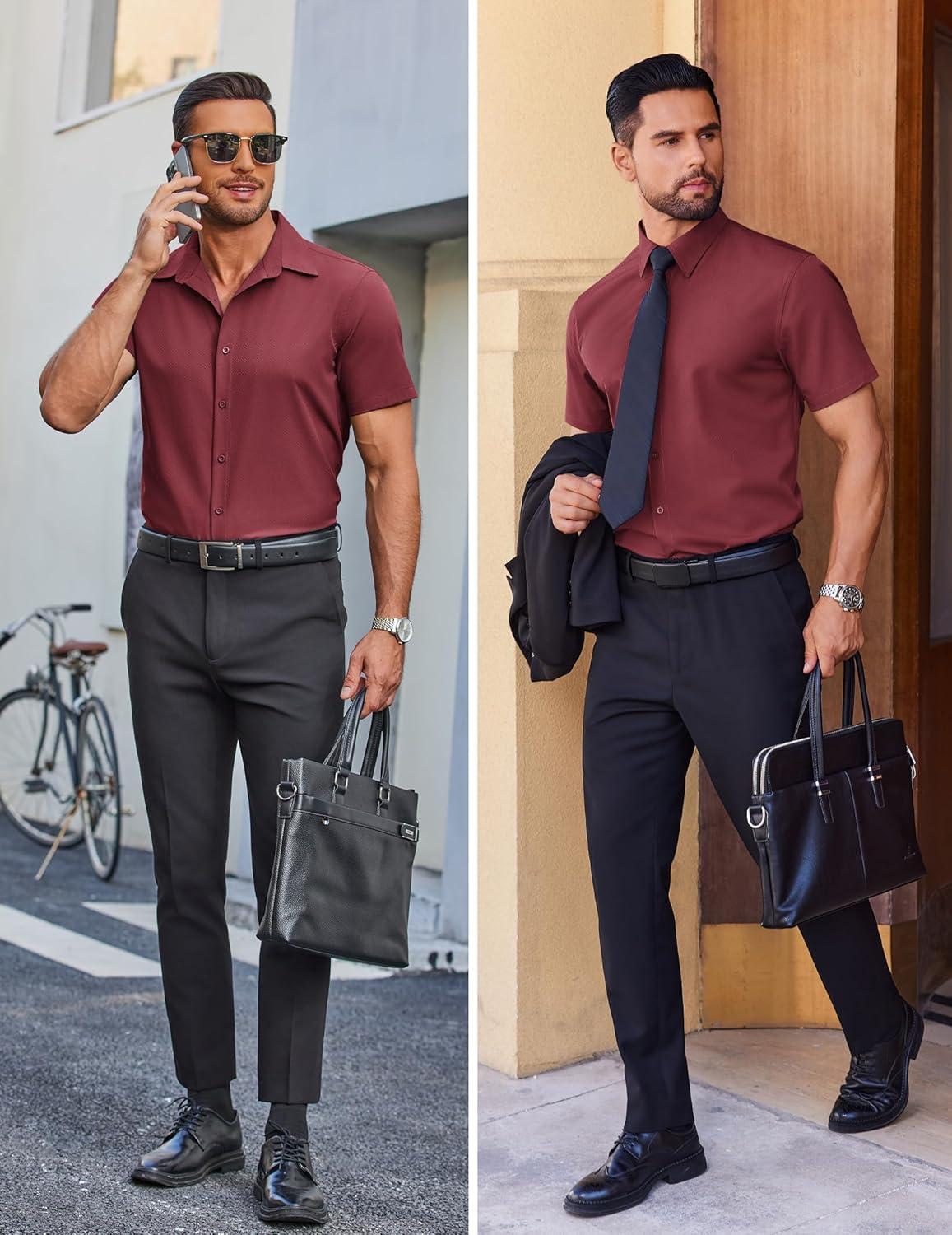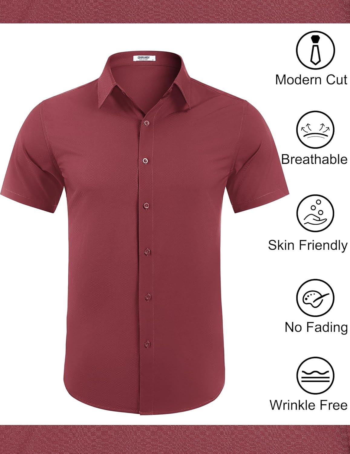 COOFANDY Mens Wrinkle Free Dress Shirt Polka Dot Short Sleeve Button Down Business Casual Shirts(Burgundy)