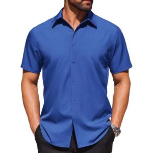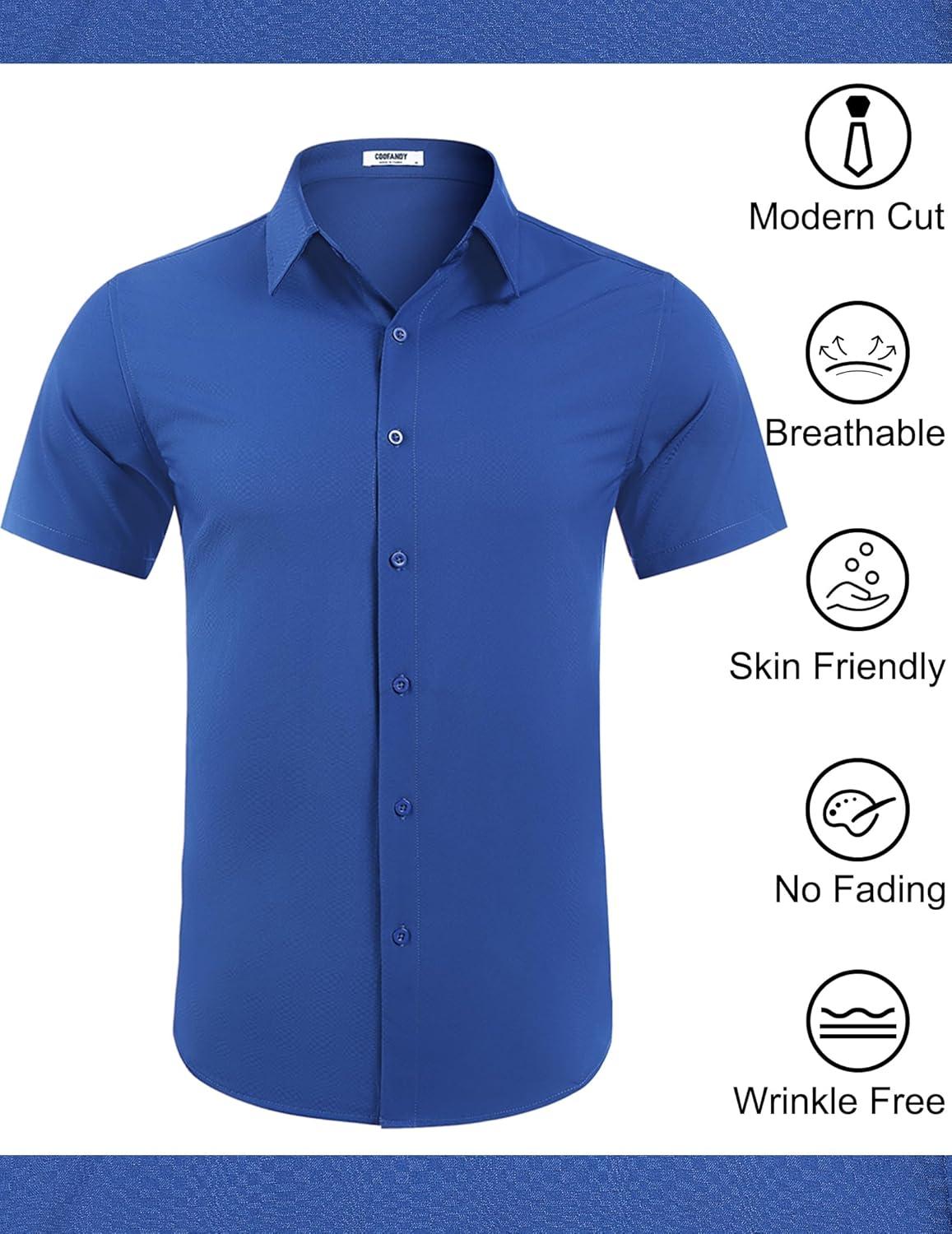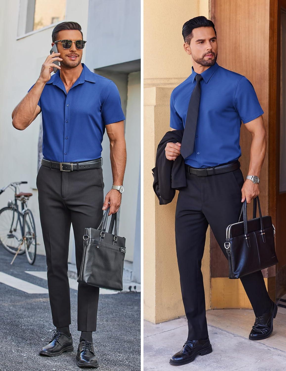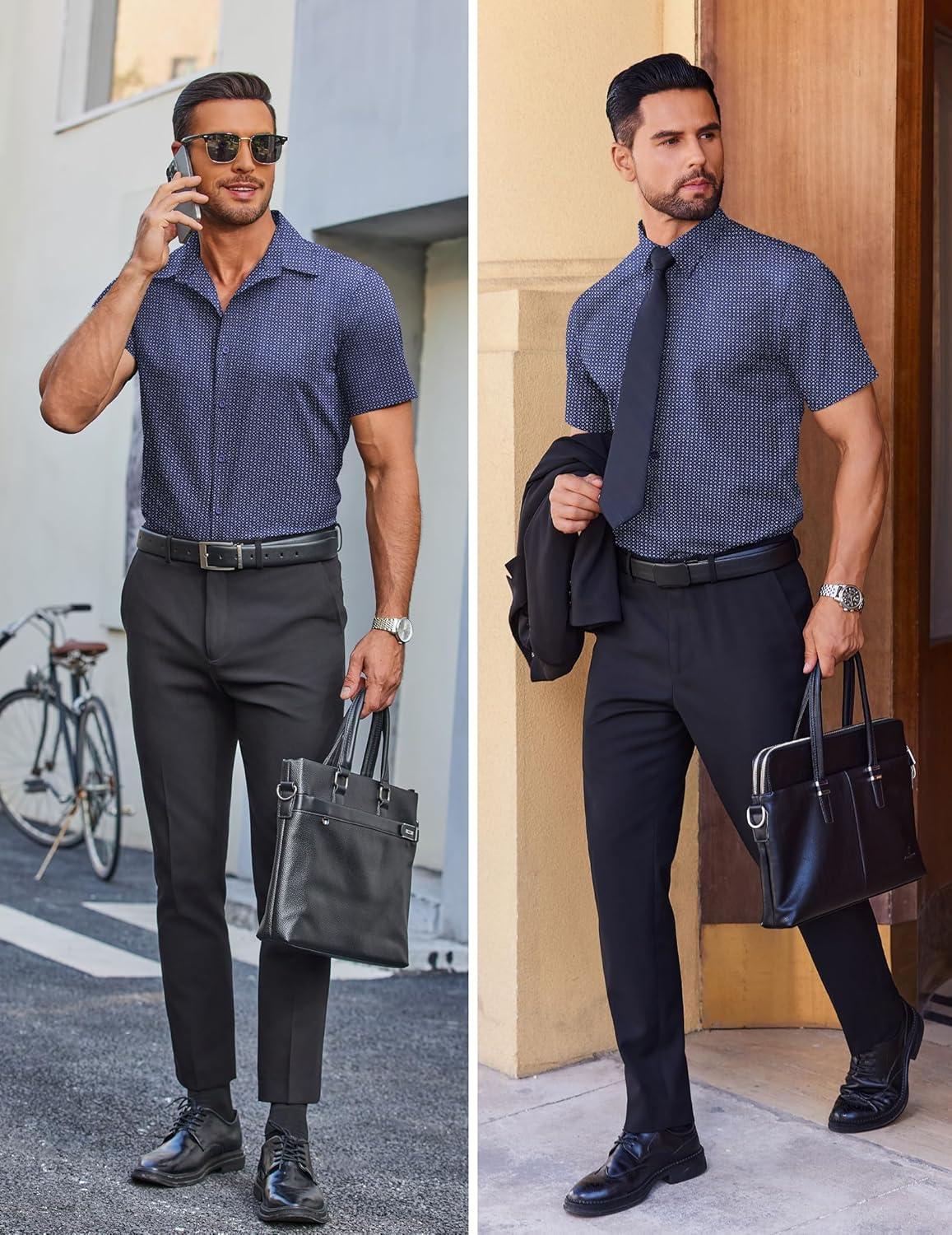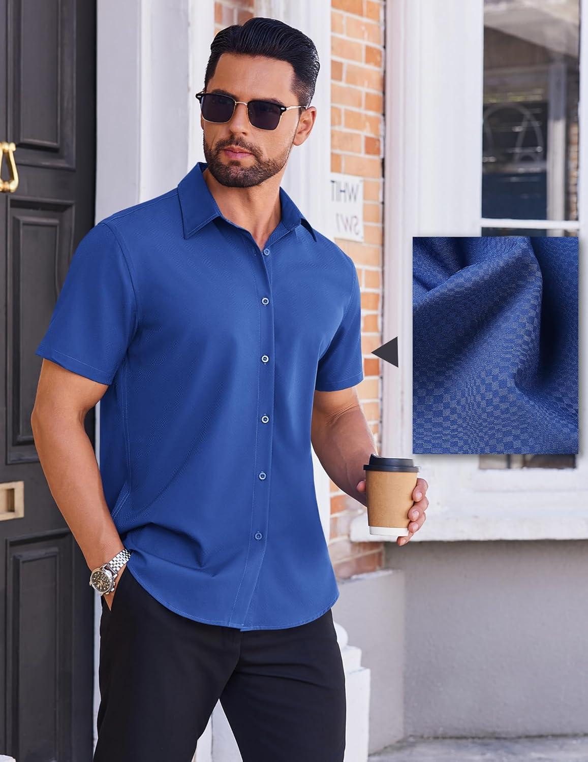 COOFANDY Mens Wrinkle Free Dress Shirt Polka Dot Short Sleeve Button Down Business Casual Shirts(Blue Black)
