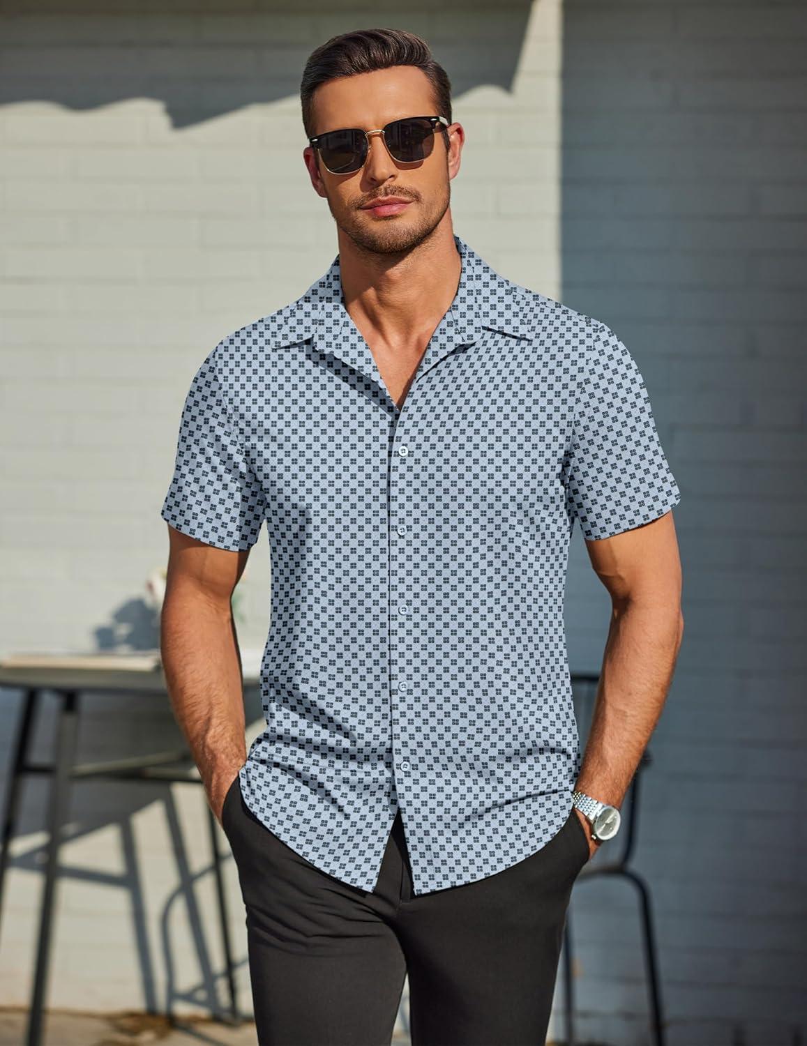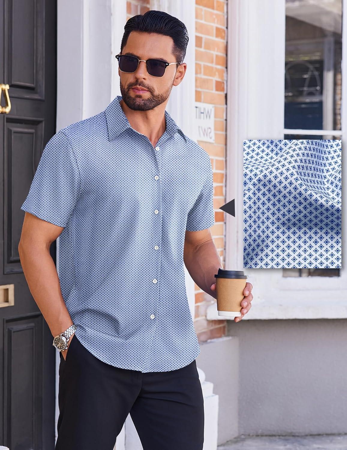 COOFANDY Mens Wrinkle Free Dress Shirt Polka Dot Short Sleeve Button Down Business Casual Shirts(Light Blue-rhombus)