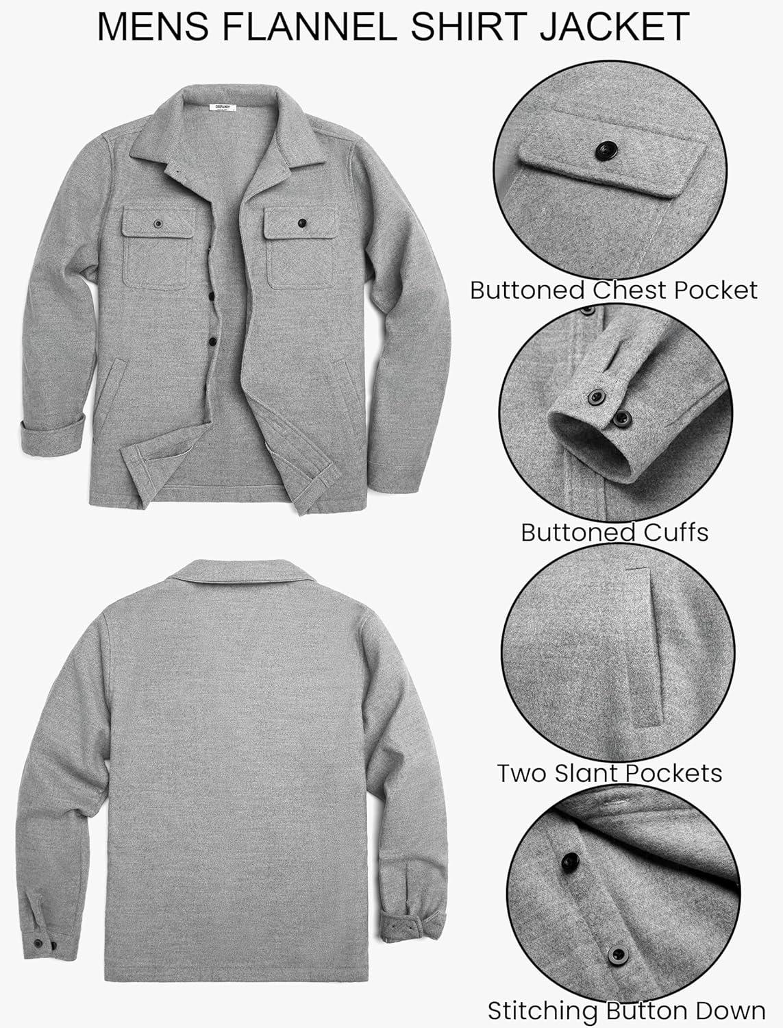 COOFANDY Men’s Flannel Jacket Plaid Shirt Jackets Fleece Shacket Long Sleeve Button Down Fall Thick Warm Outwear(Pure Grey)