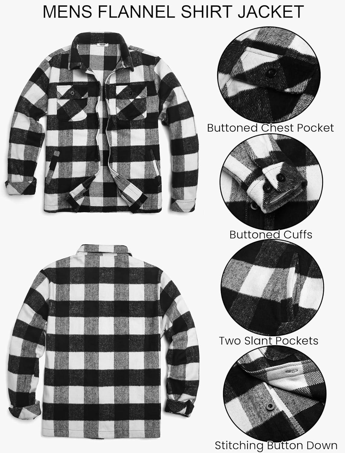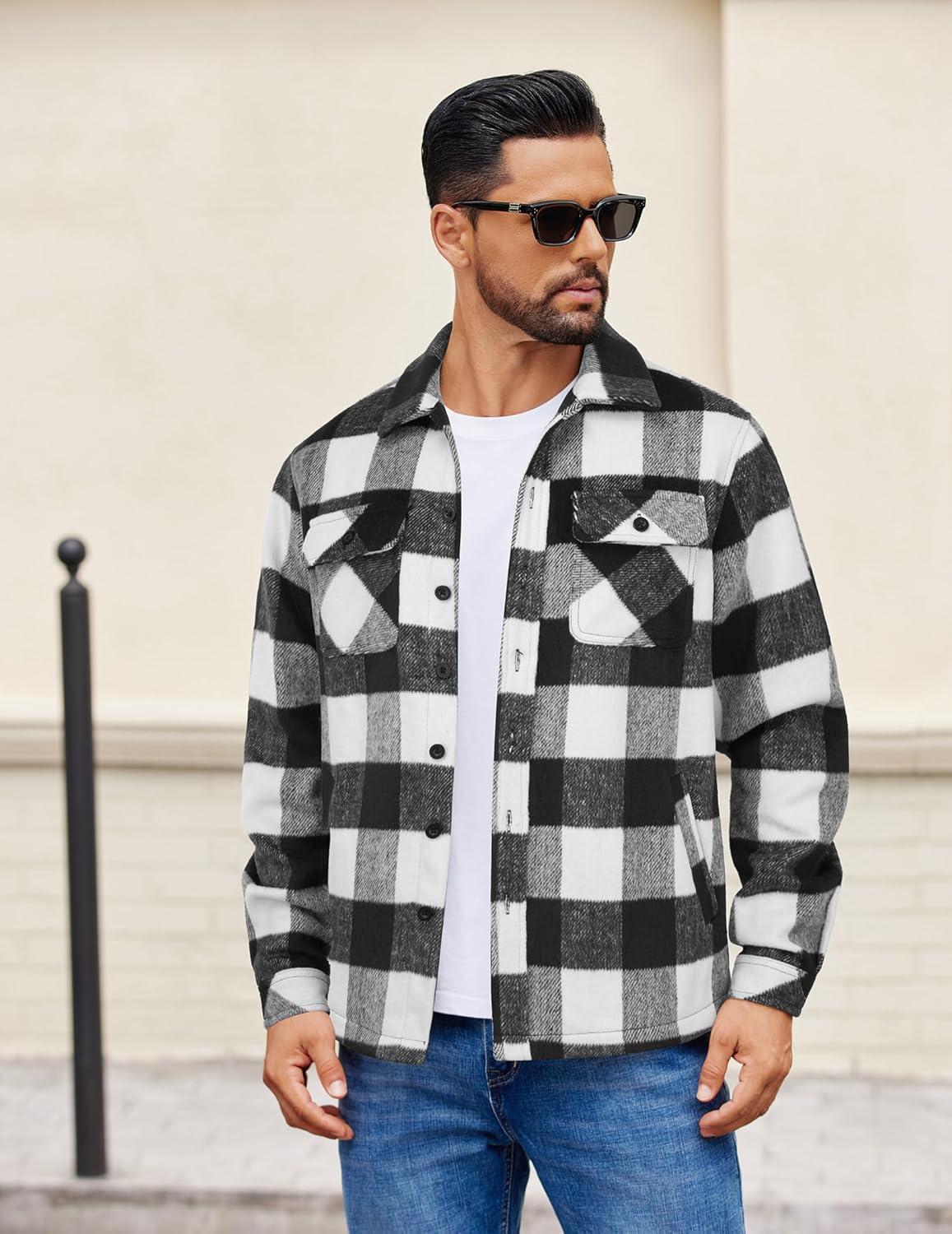COOFANDY Men’s Flannel Jacket Plaid Shirt Jackets Fleece Shacket Long Sleeve Button Down Fall Thick Warm Outwear(White Black Plaid)