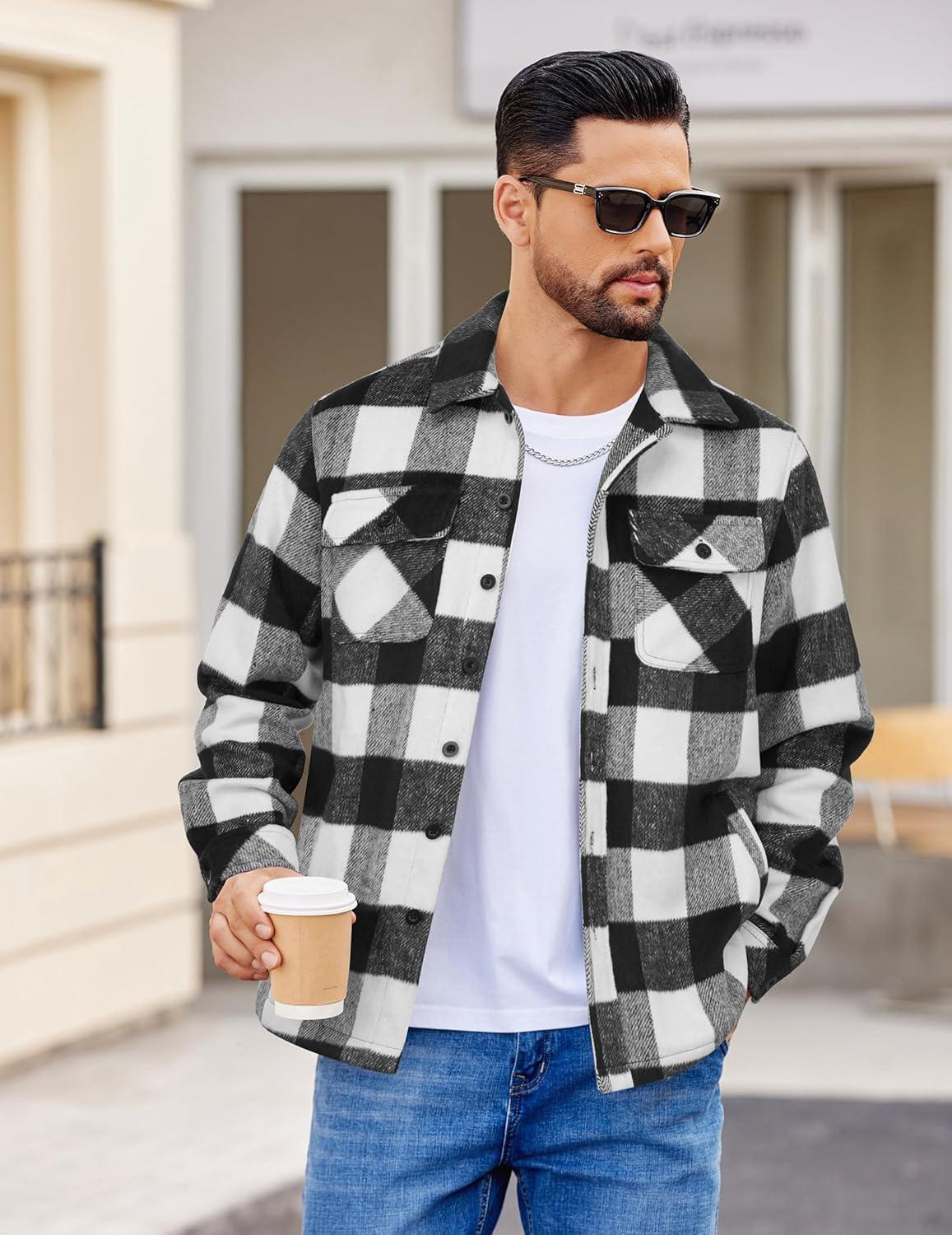 COOFANDY Men’s Flannel Shirts Casual Button Down Plaid Shirt Jacket Long Sleeve Fleece Shacket(Black&white Plaid)