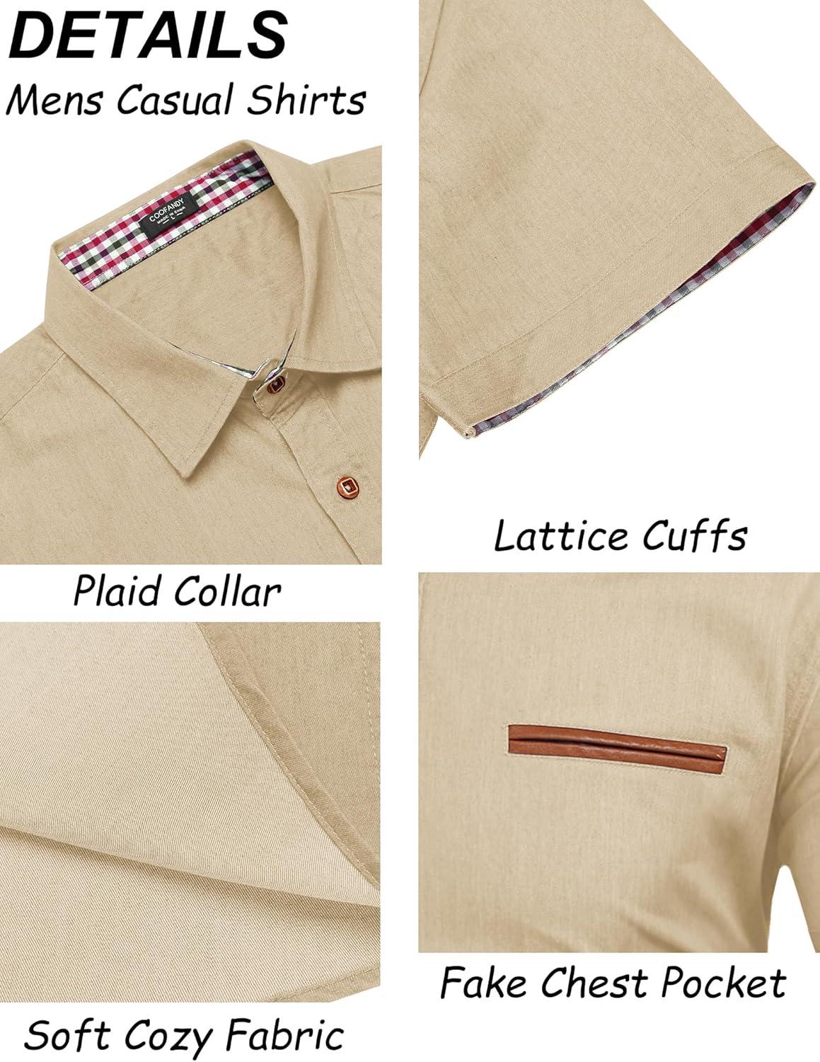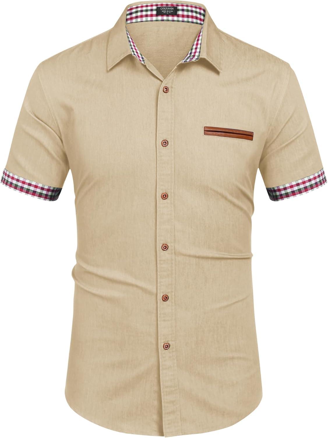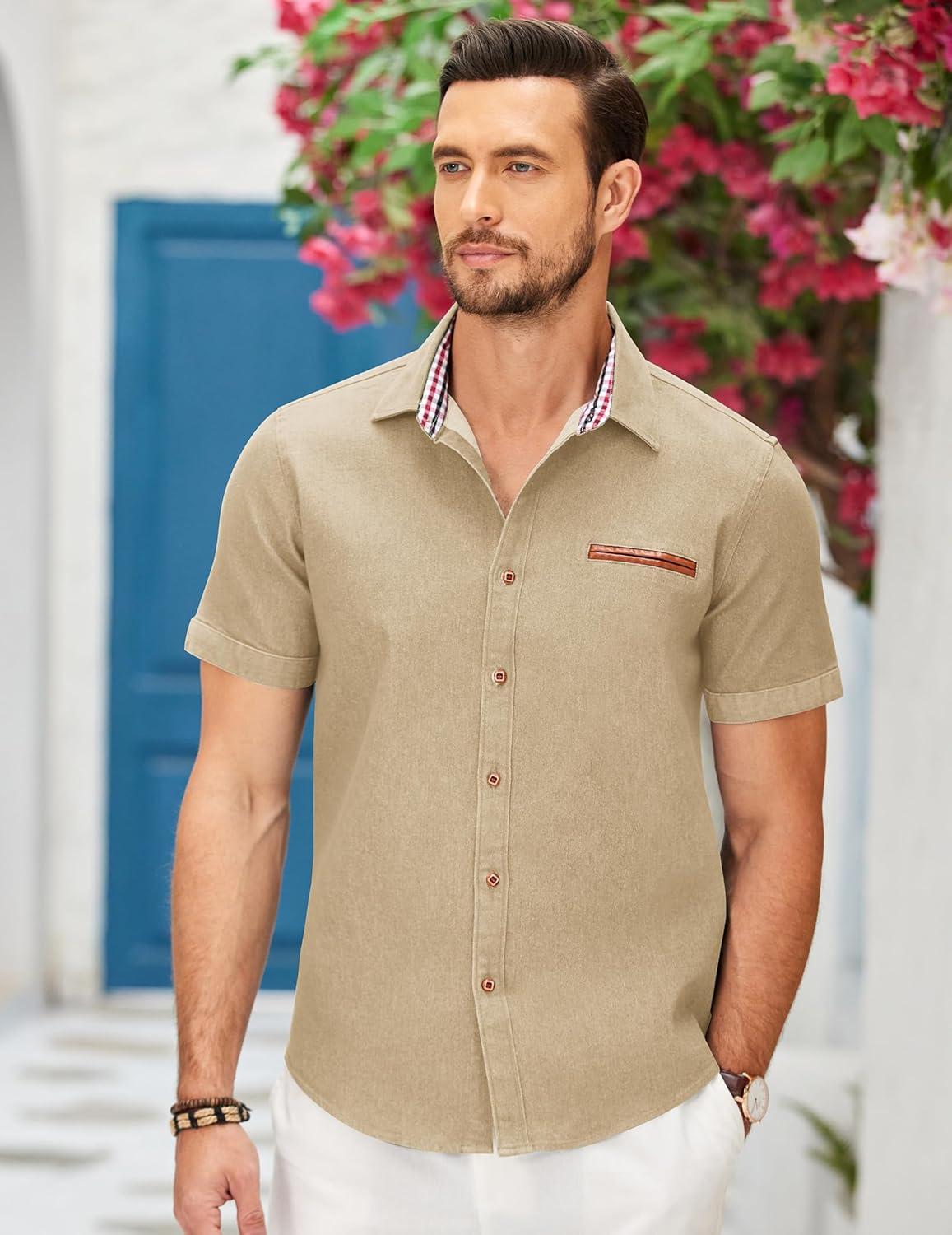 COOFANDY Men’s Casual Short Sleeve Button Down Dress Shirt Plaid Collar Denim Work Shirts(A – Khaki- No Pocket)