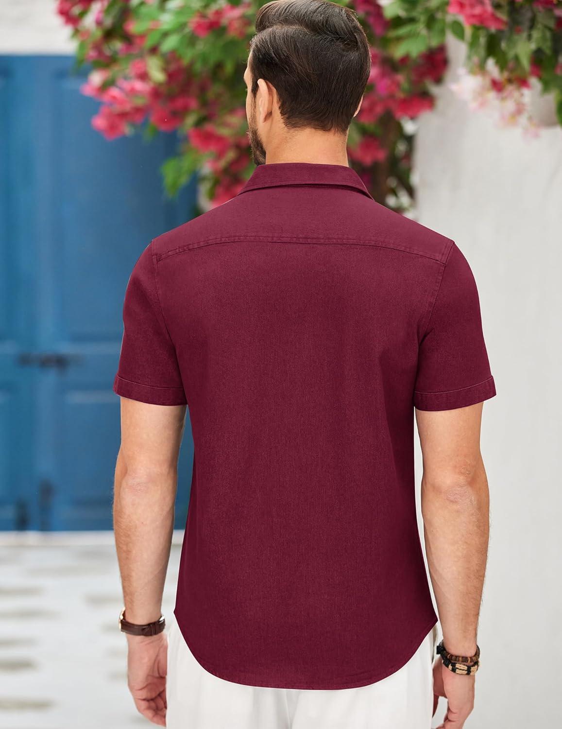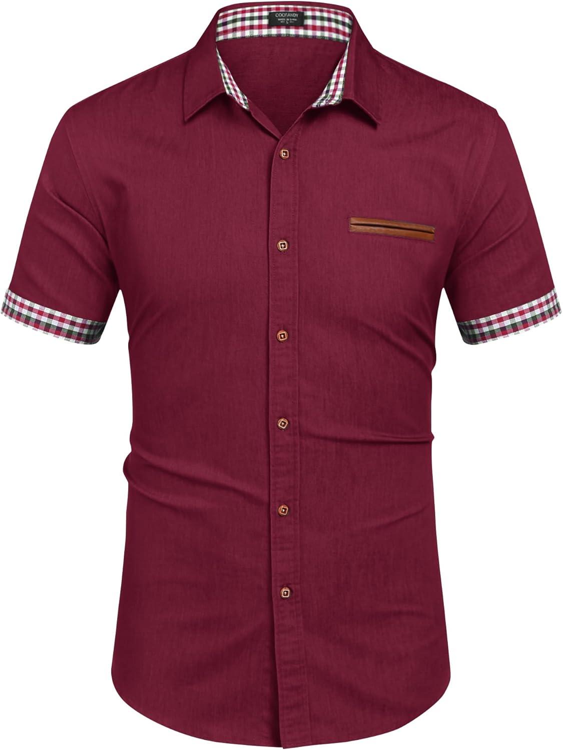 COOFANDY Men’s Casual Short Sleeve Button Down Dress Shirt Plaid Collar Denim Work Shirts(A – Wine Red – No Pocket)
