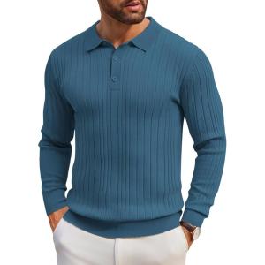 COOFANDY Men’s Knit Polo Shirts Long Sleeve Casual Button Down Ribbed Polo Shirt Fashion Golf Shirts(Denim Blue)