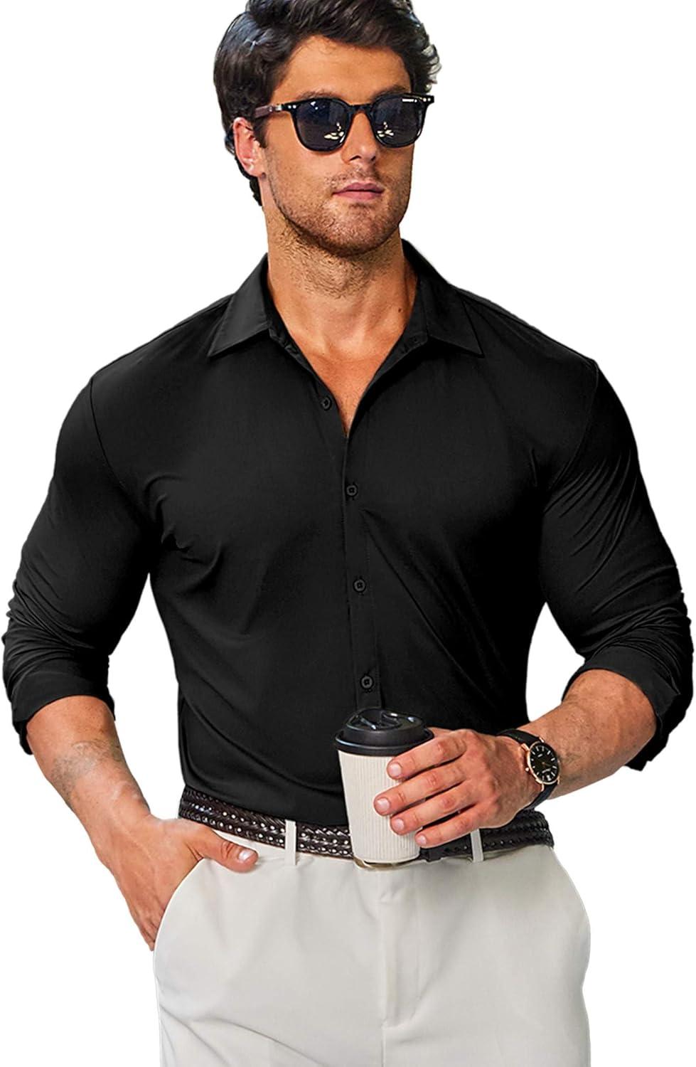 COOFANDY Mens Stretch Dress Shirts Muscle Fit Wrinkle Free Long Sleeve Button Down Shirt Business Casual Shirts(Black)