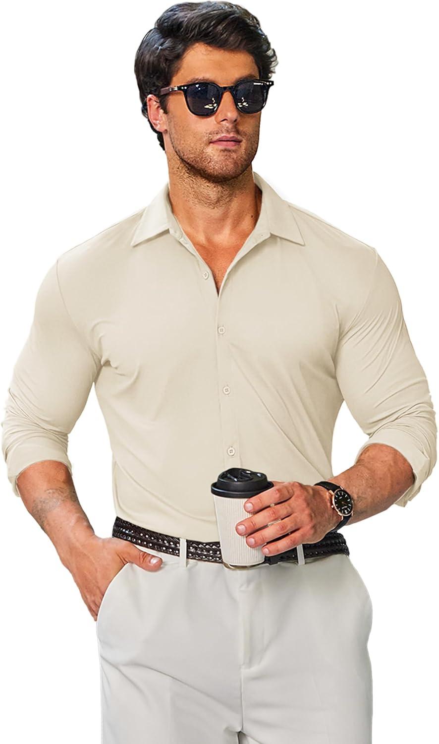 COOFANDY Mens Stretch Dress Shirts Muscle Fit Wrinkle Free Long Sleeve Button Down Shirt Business Casual Shirts(Light Beige)