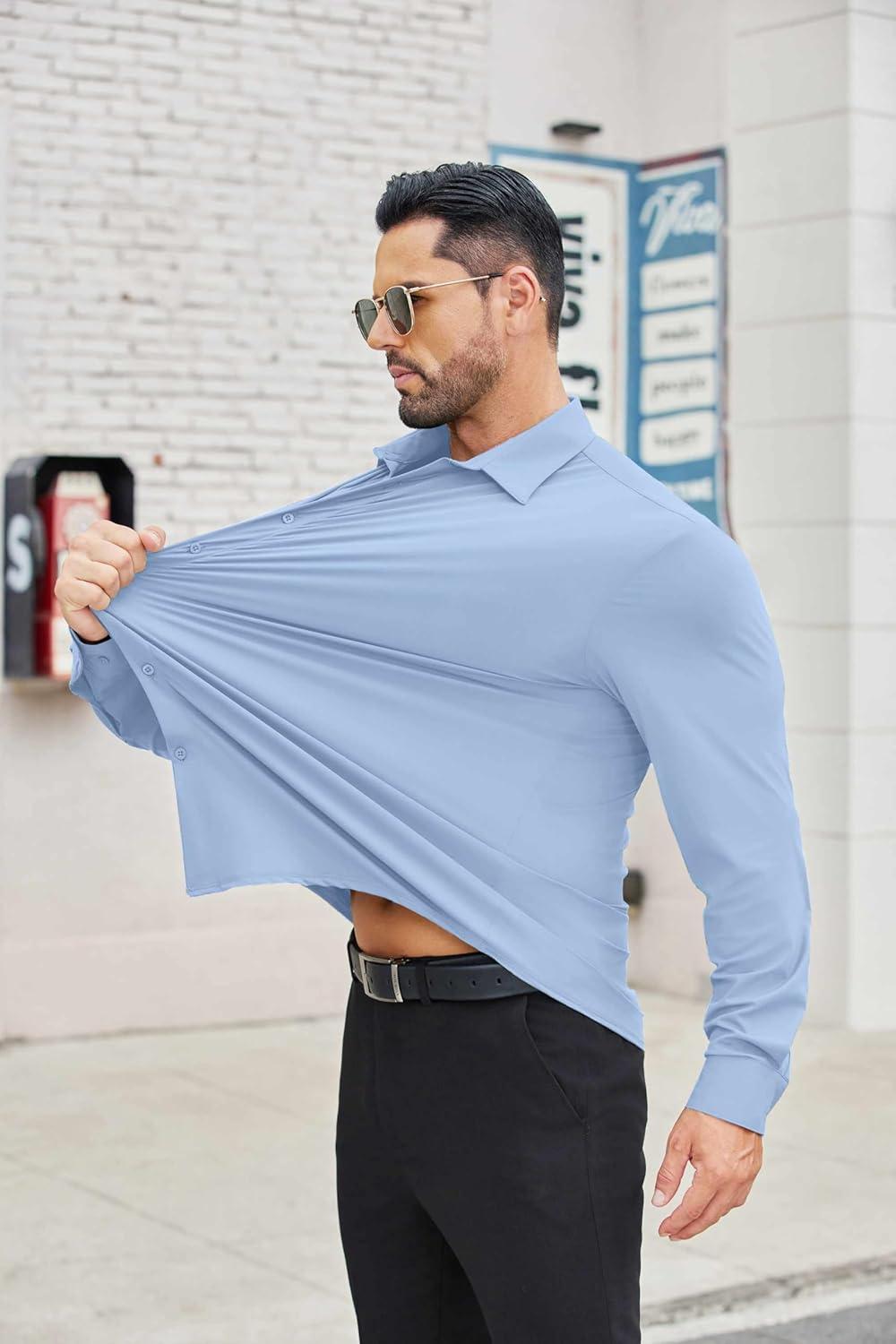 COOFANDY Mens Stretch Dress Shirts Muscle Fit Wrinkle Free Long Sleeve Button Down Shirt Business Casual Shirts(Light Blue)