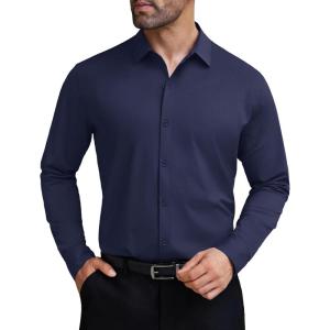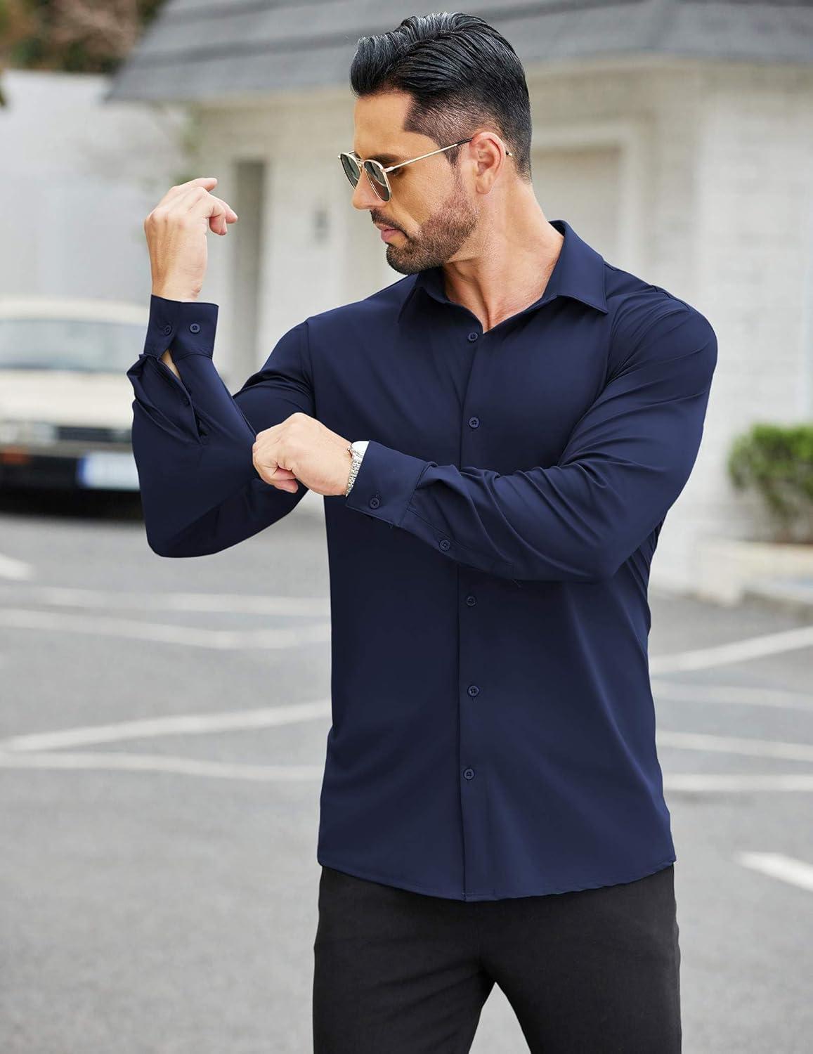 COOFANDY Mens Stretch Dress Shirts Muscle Fit Wrinkle Free Long Sleeve Button Down Shirt Business Casual Shirts(Navy Blue)