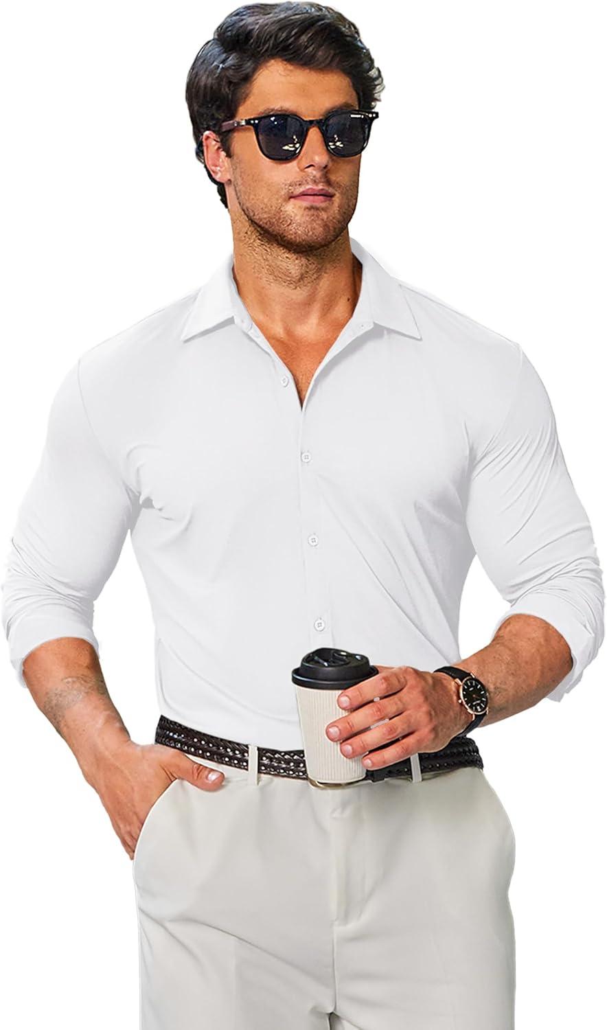 COOFANDY Mens Stretch Dress Shirts Muscle Fit Wrinkle Free Long Sleeve Button Down Shirt Business Casual Shirts(White)