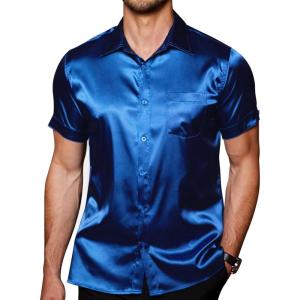 COOFANDY Mens Silk Button Down Short Sleeve Shirt Satin Dress Shirts Summer Beach Wedding Shirt(Royal Blue-pure)