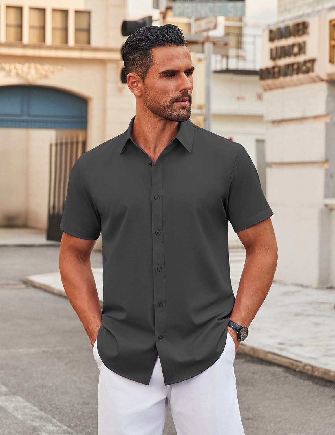 COOFANDY Men’s Stretch Dress Shirts Short Sleeve Wrinkle Free Casual Button Down Shirts(Dark Grey)