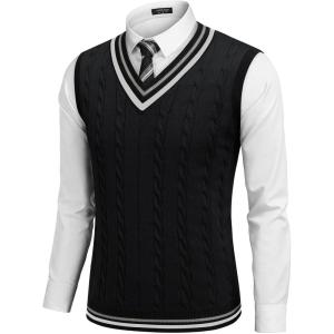 COOFANDY Men’s Sweater Vest V Neck Casual Sleeveless Pullover Striped Cable Knit Sweater Vest(Black)