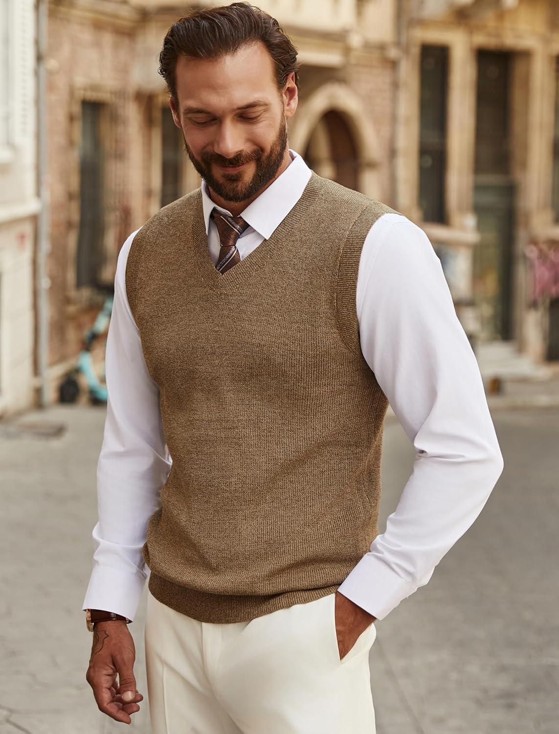 COOFANDY Men’s Sweater Vest V Neck Sleeveless Sweater Slim Fit Casual Knitted Pullover Sweater(Brown)