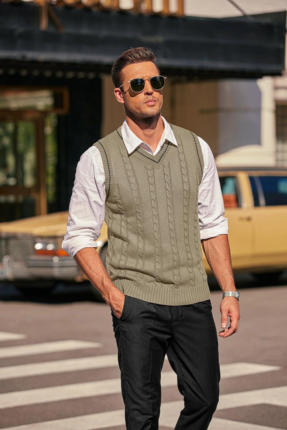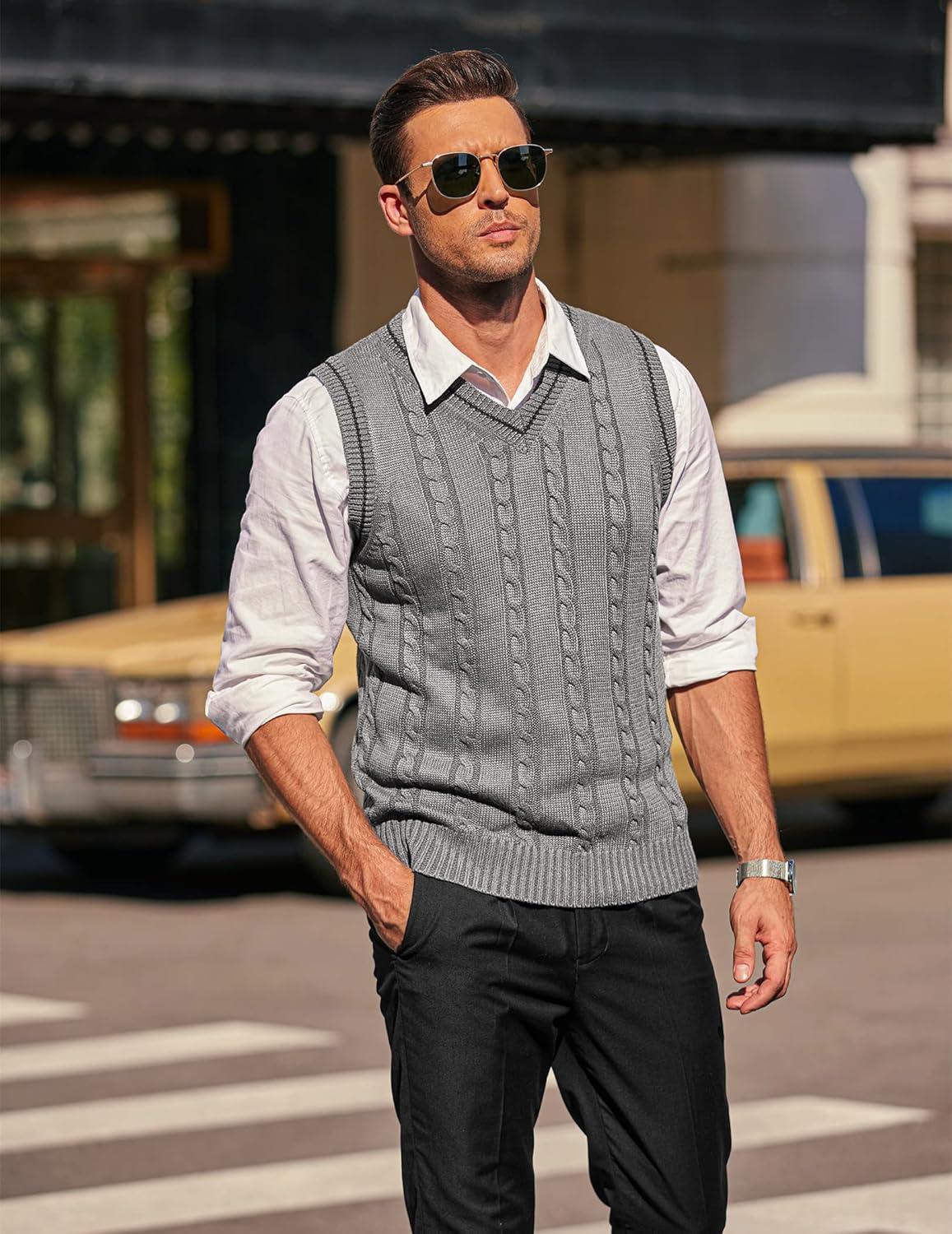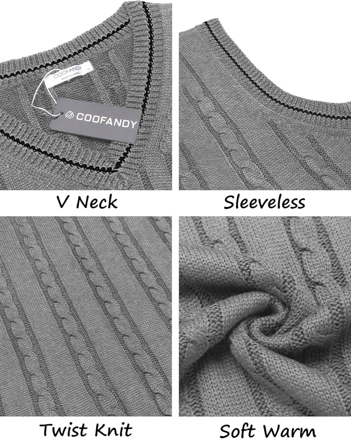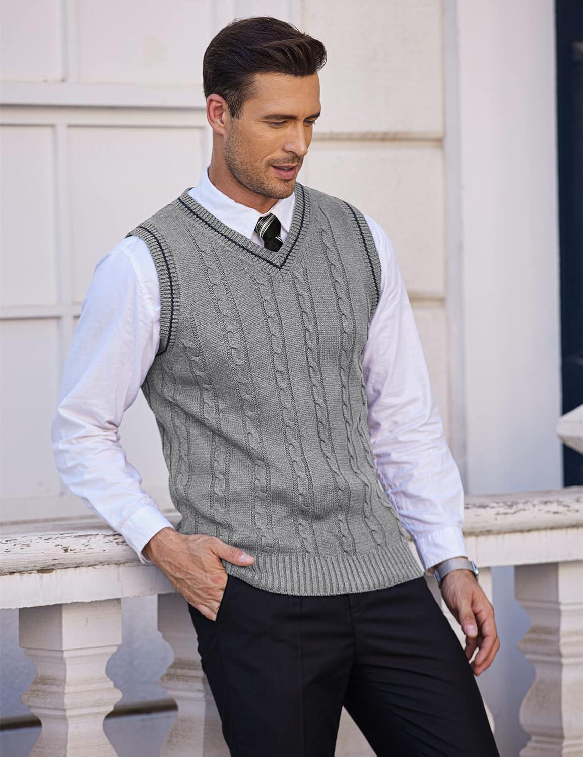 COOFANDY Men’s Sweater Vest V Neck Slim Fit Casual Sleeveless Twisted Knitted Pullover Sweater(Light Grey)