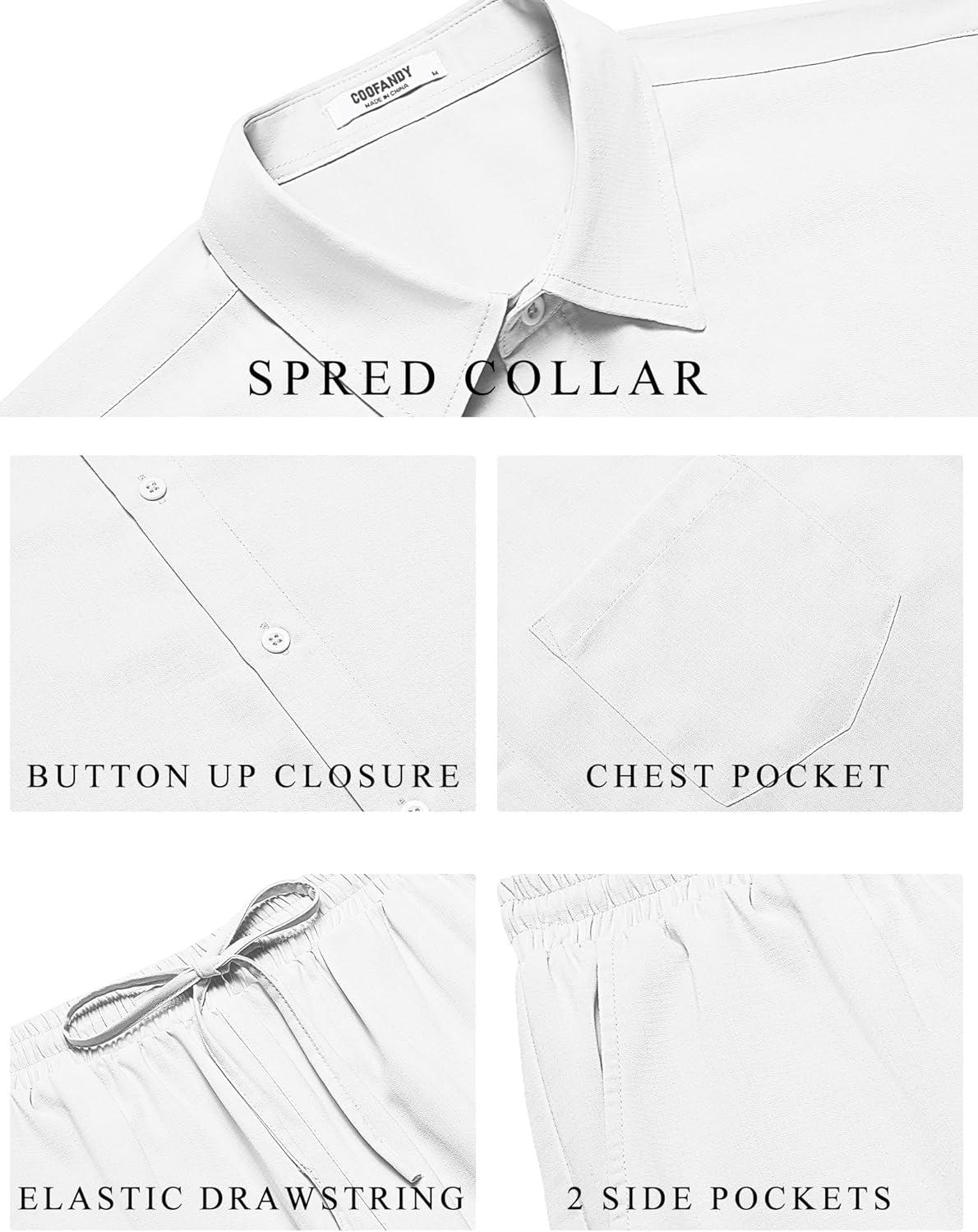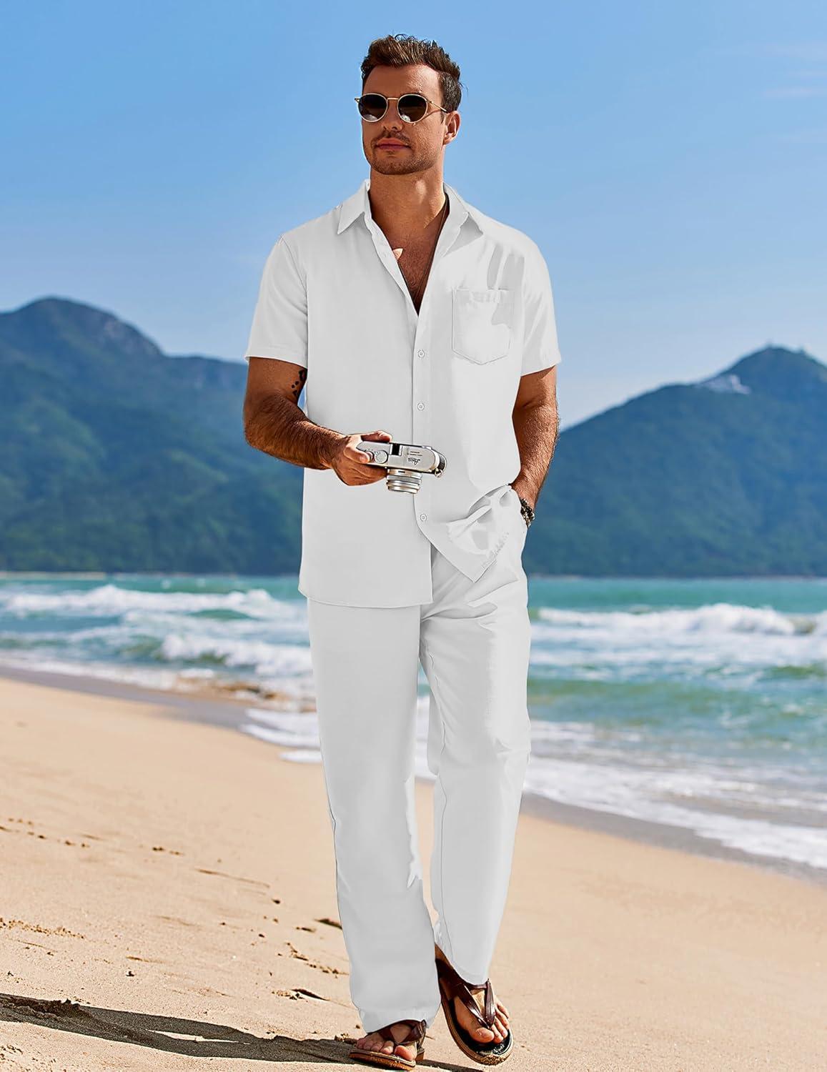 COOFANDY Mens 2 Piece Casual Beach Outfits Short Sleeve Button Down Shirts Summer Loose Pant Sets Vacation Walking Outfits(A-white)