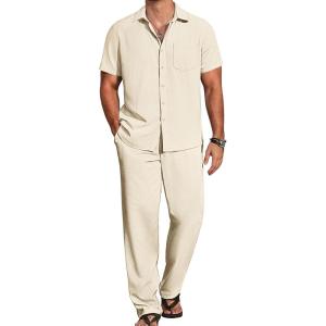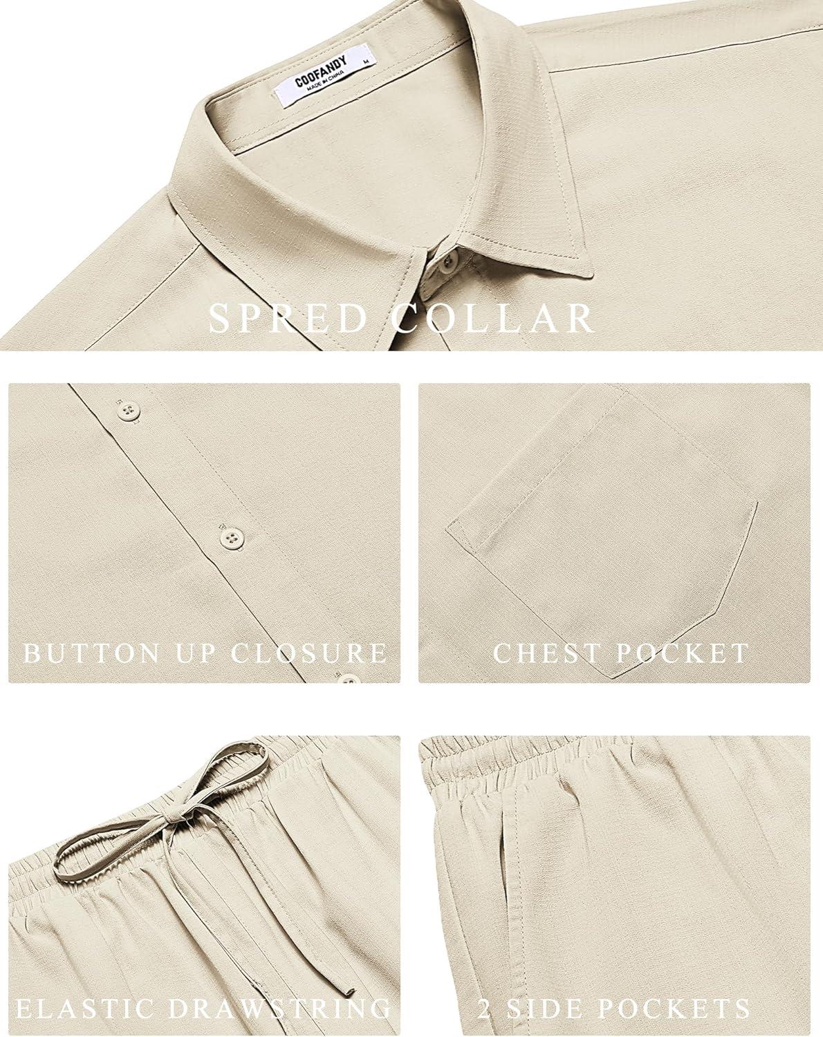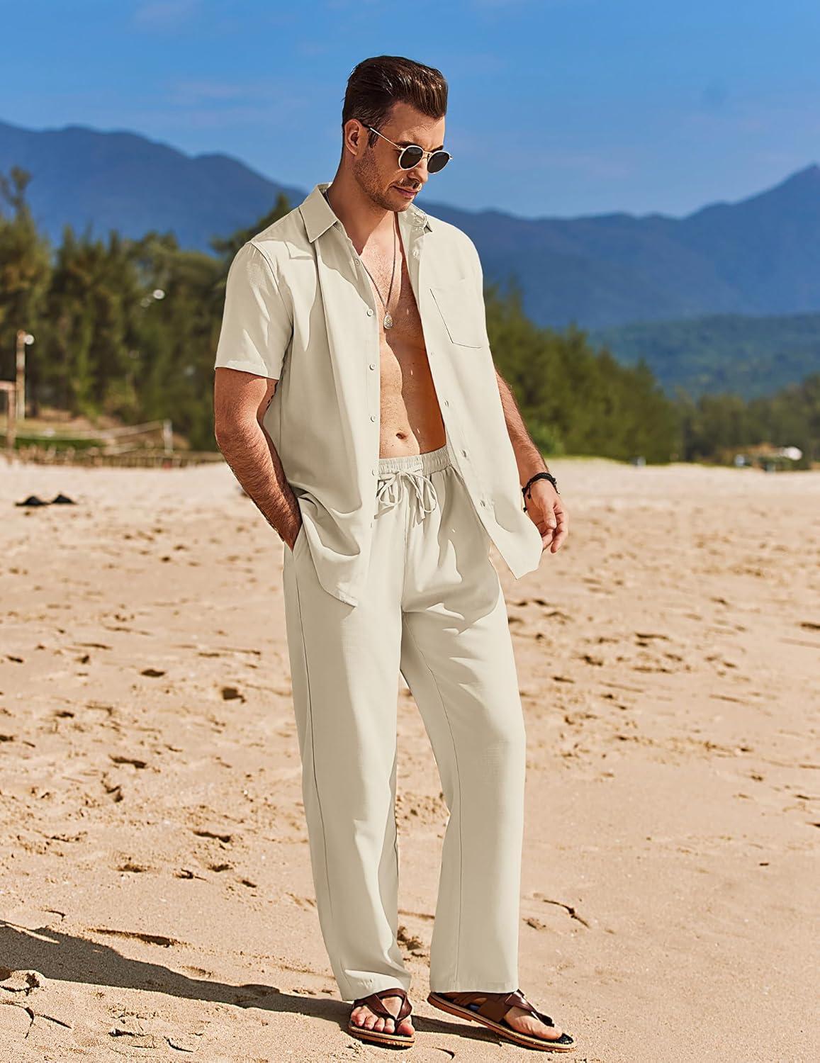 COOFANDY Mens 2 Piece Casual Beach Outfits Short Sleeve Button Down Shirts Summer Loose Pant Sets Vacation Walking Outfits(Beige)