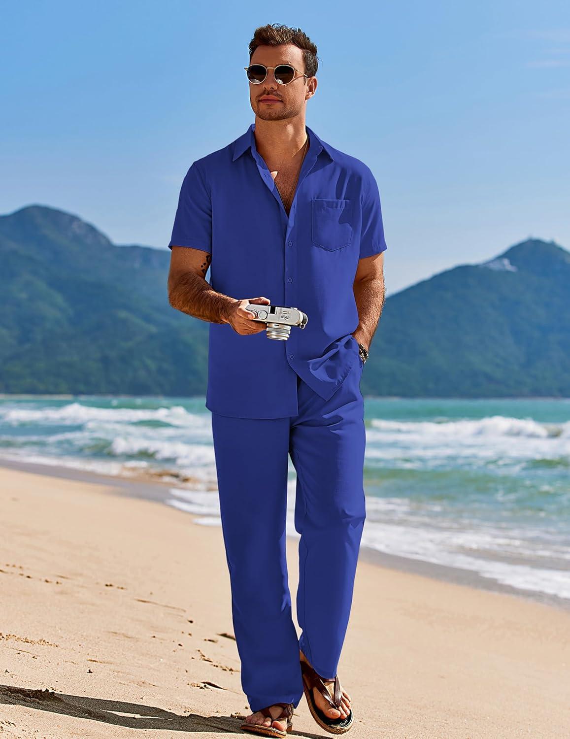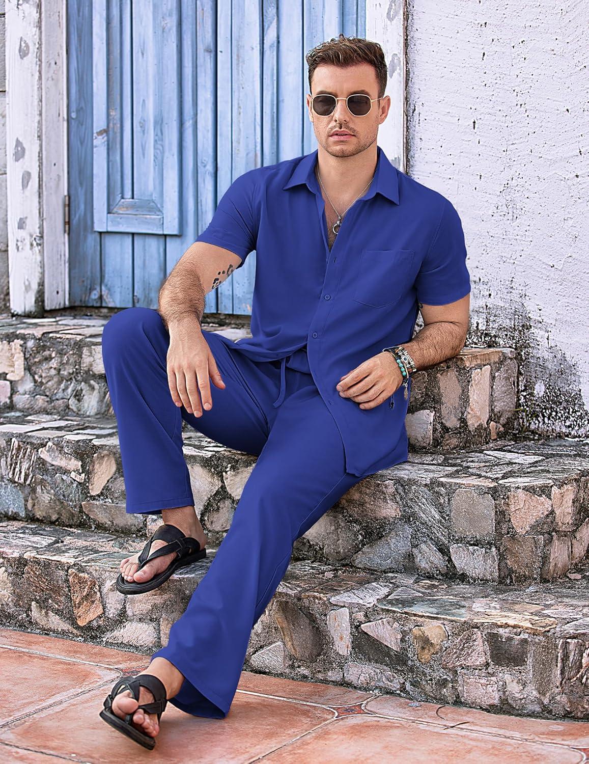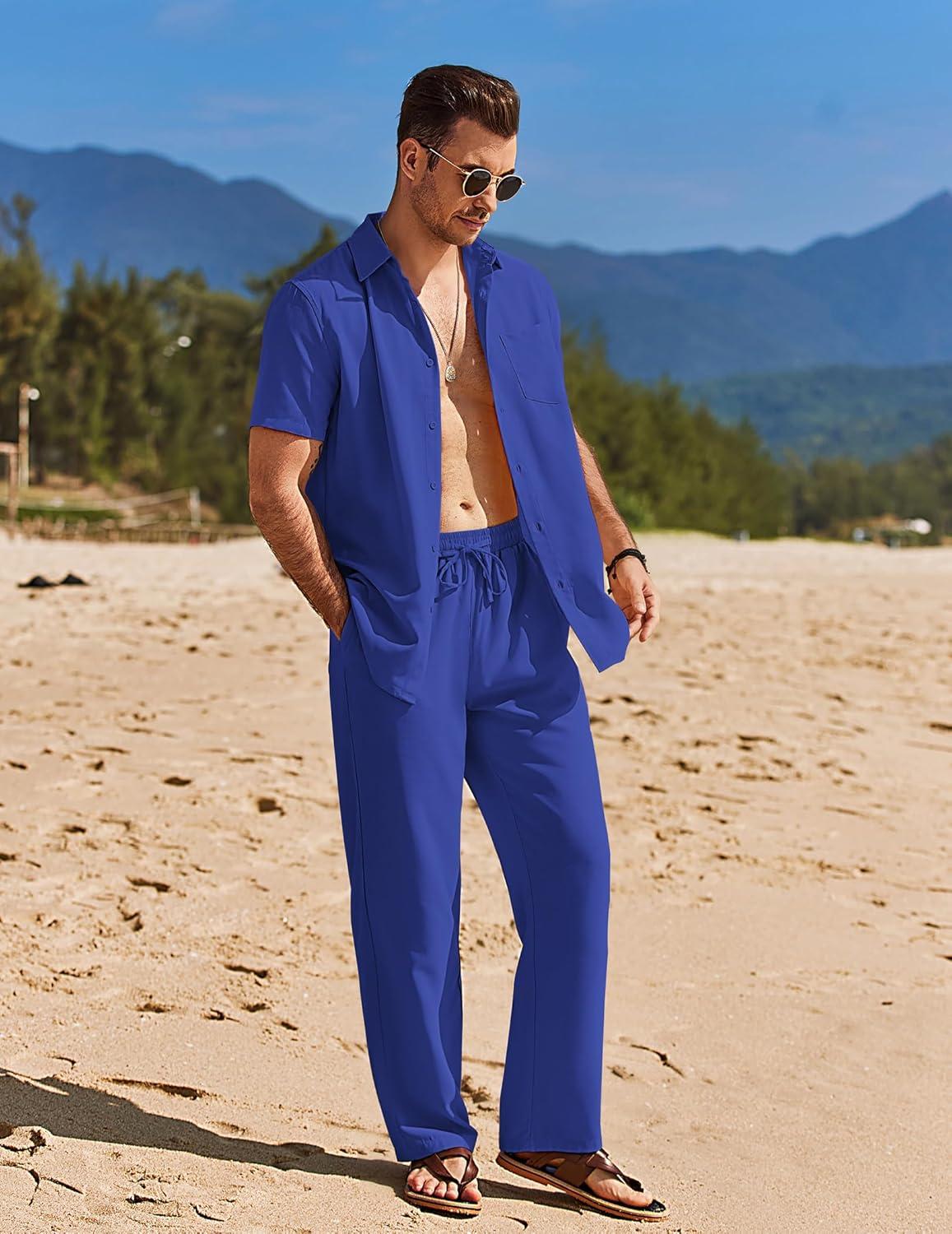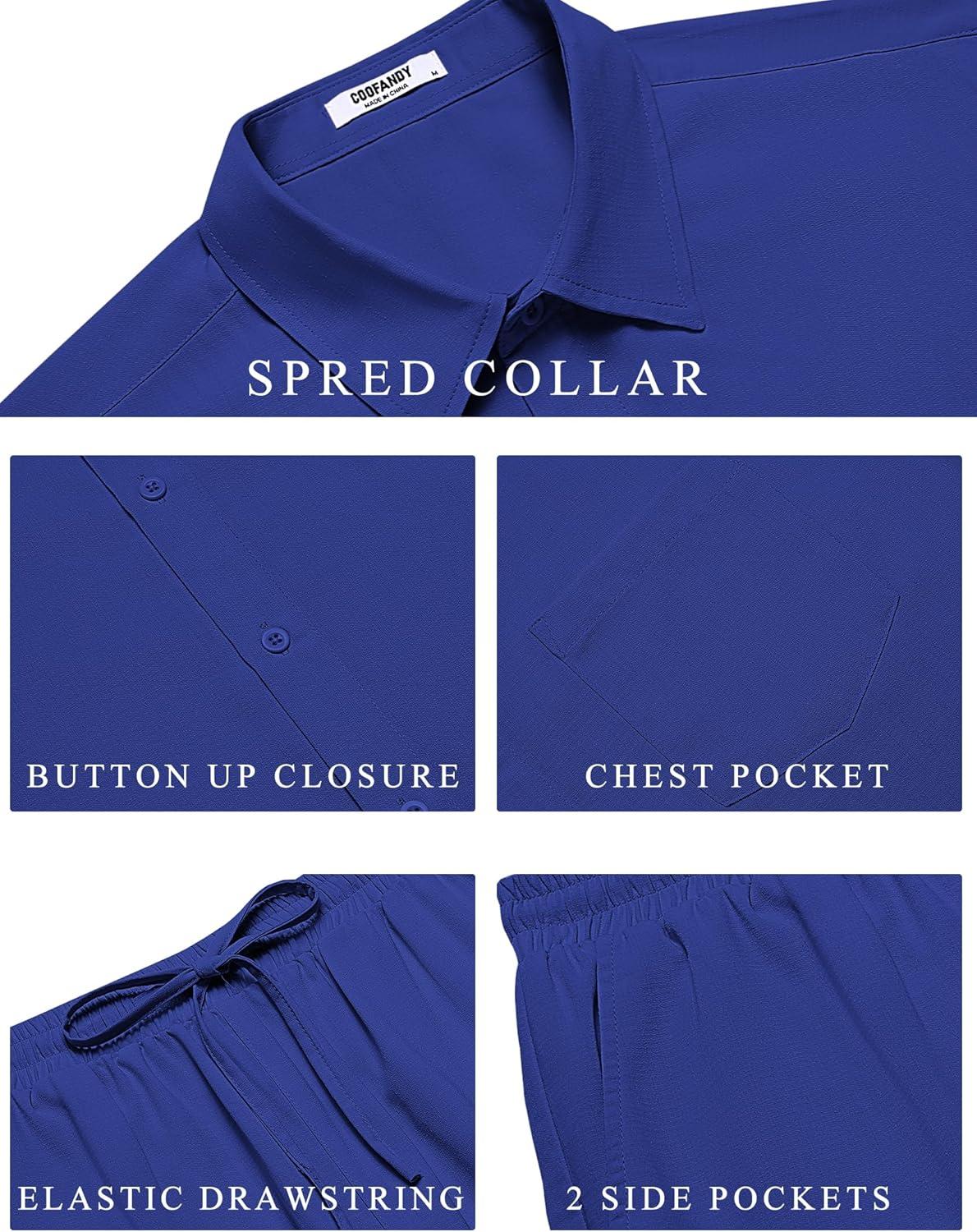 COOFANDY Mens 2 Piece Casual Beach Outfits Short Sleeve Button Down Shirts Summer Loose Pant Sets Vacation Walking Outfits(Dark Blue)