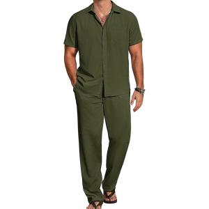 COOFANDY Mens 2 Piece Casual Beach Outfits Short Sleeve Button Down Shirts Summer Loose Pant Sets Vacation Walking Outfits(Army Green)