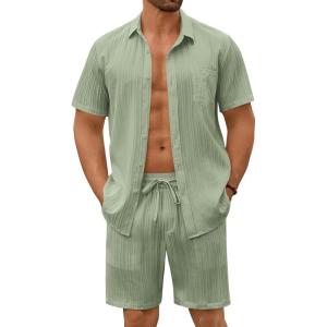 COOFANDY Mens Beach Outfits 2 Piece Sets Casual Short Sleeve Button Down Summer Textured Shirt(Light Green)