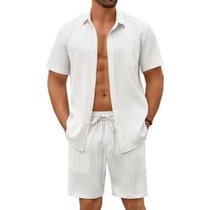 COOFANDY Mens Beach Outfits 2 Piece Sets Casual Short Sleeve Button Down Summer Textured Shirt(White)