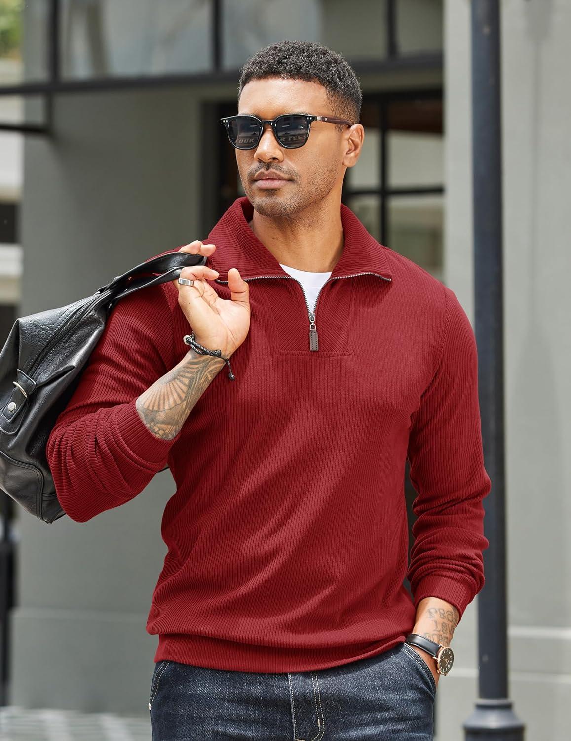COOFANDY Men’s Quarter Zip Up Pullover Mock Neck Long Sleeve Sweater Casual Corduroy Polo Sweatshirt(Wine Red)