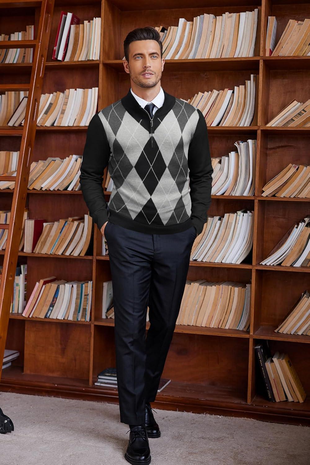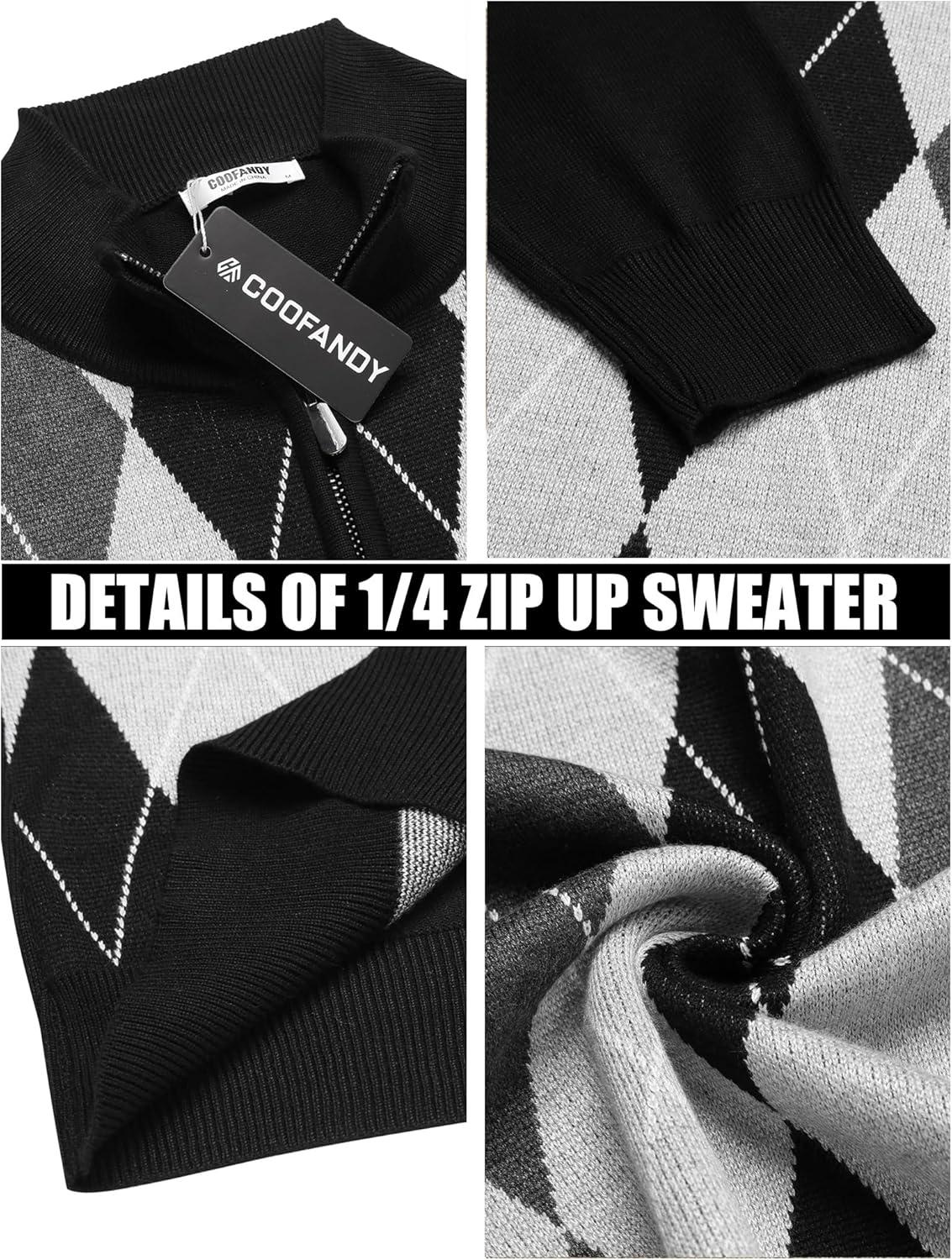 COOFANDY Men’s Quarter Zip Up Sweaters Slim Fit Lightweight Mock Neck Pullover Casual Polo Sweaters(Black Argyle)