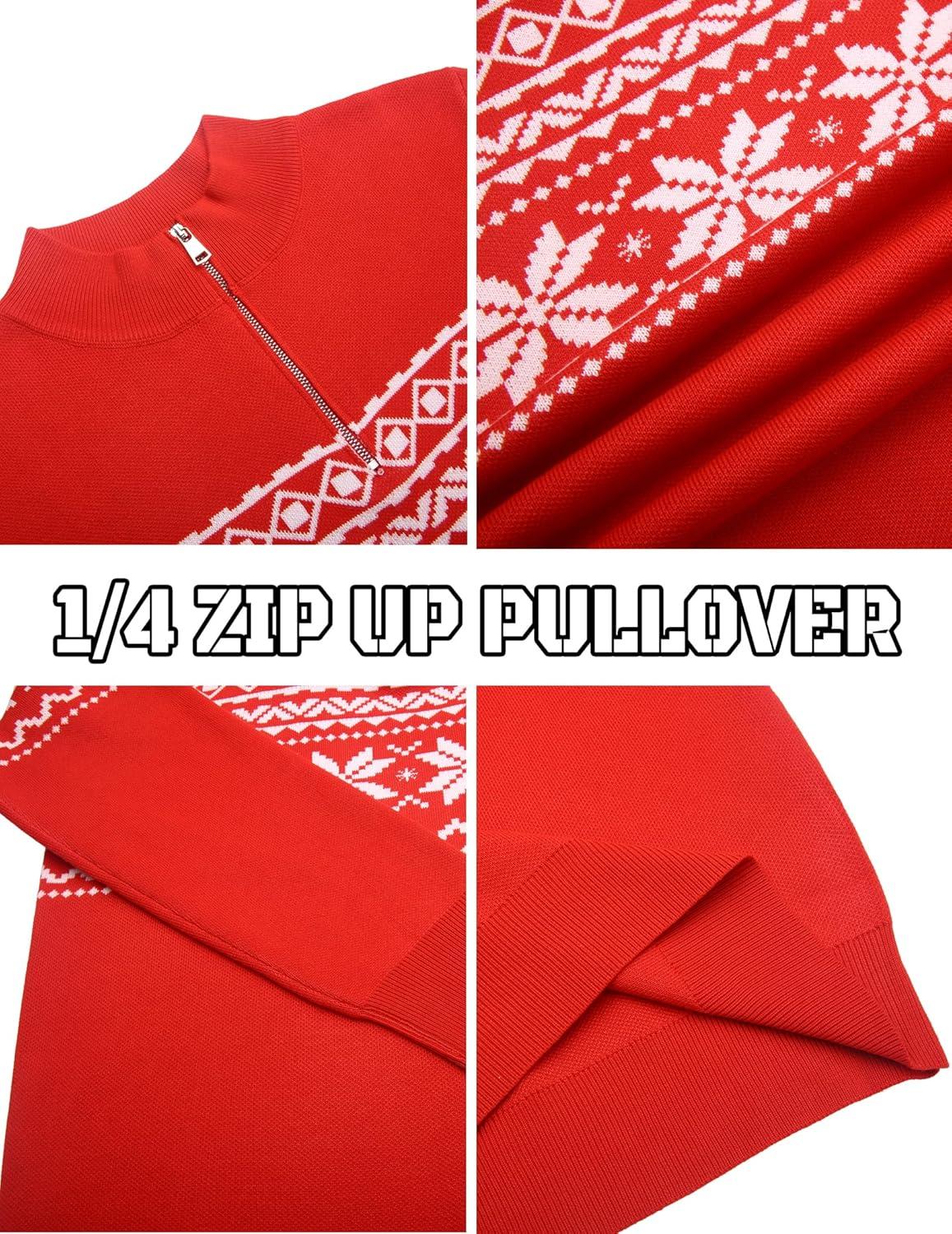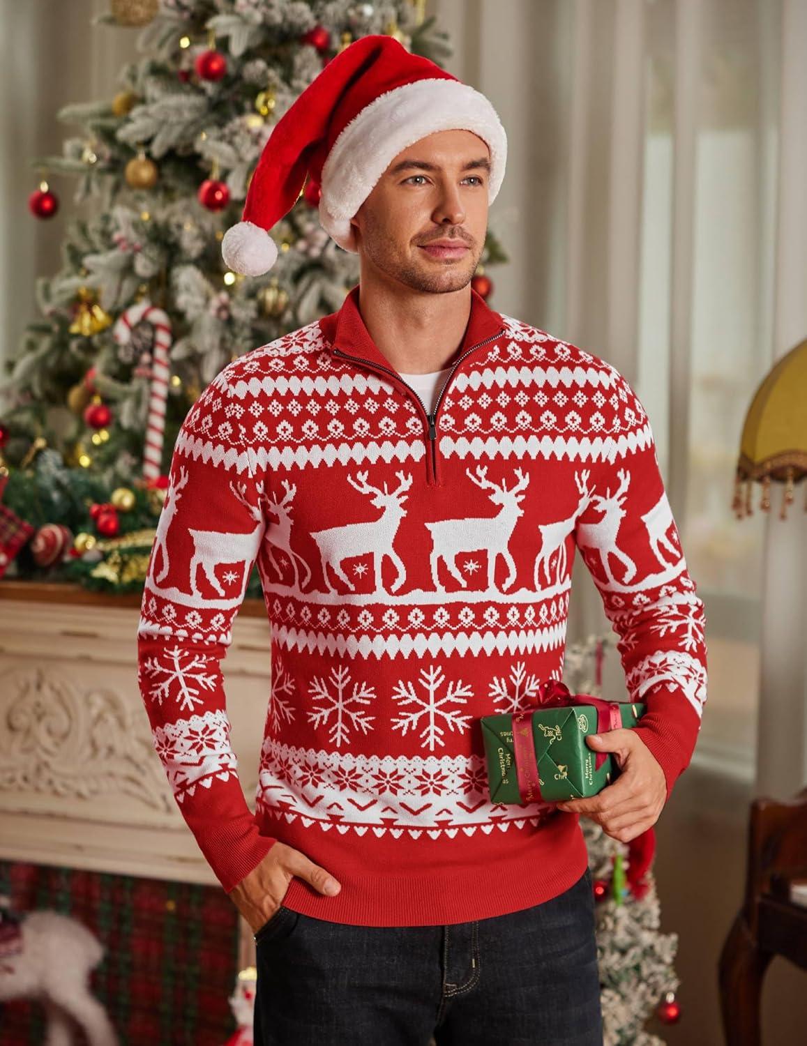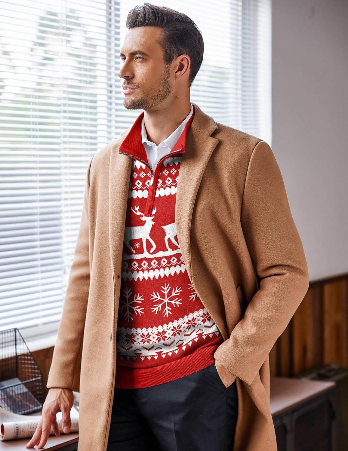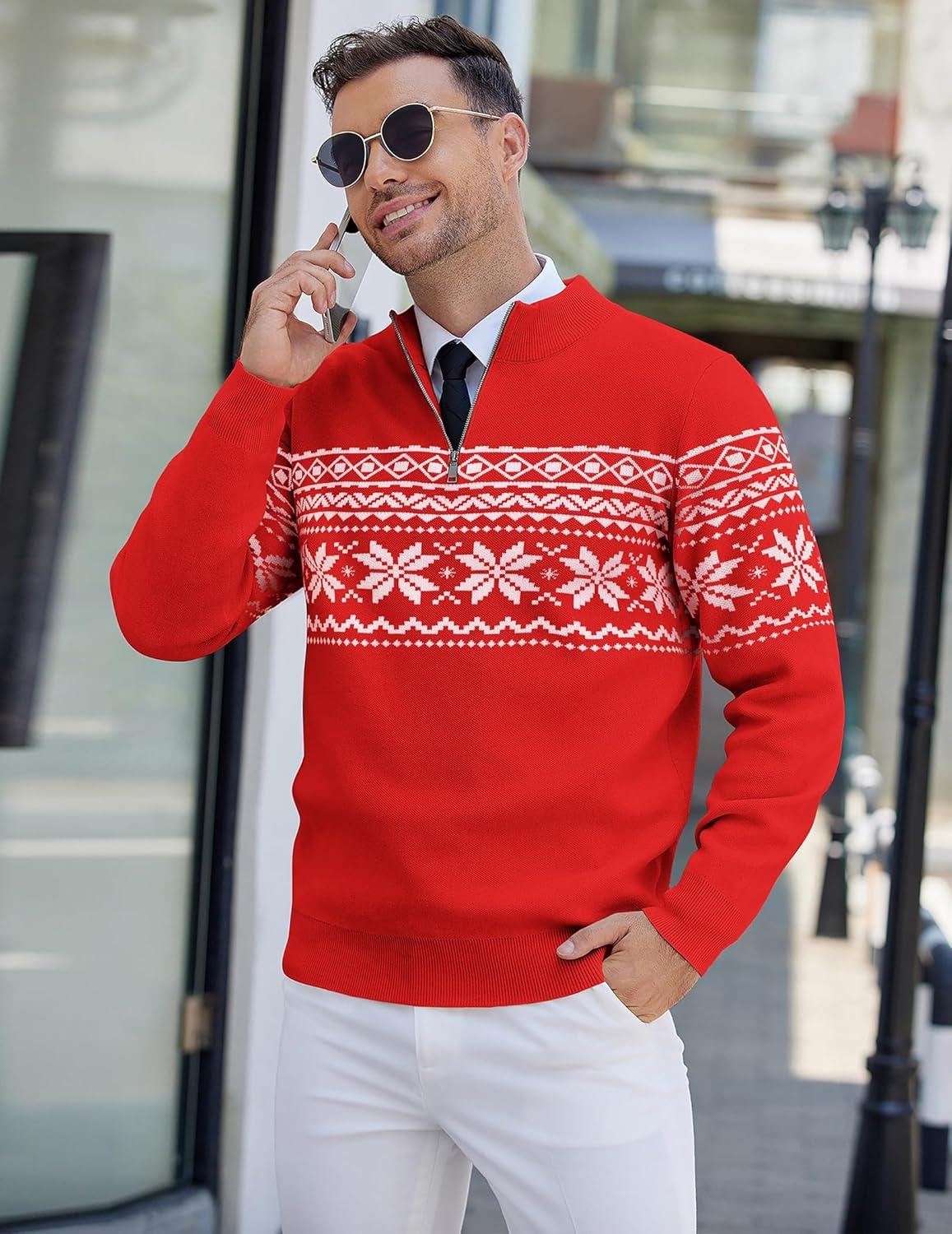 COOFANDY Men’s Quarter Zip Up Sweaters Slim Fit Lightweight Mock Neck Pullover Casual Polo Sweaters(Christmas Red & Elk)