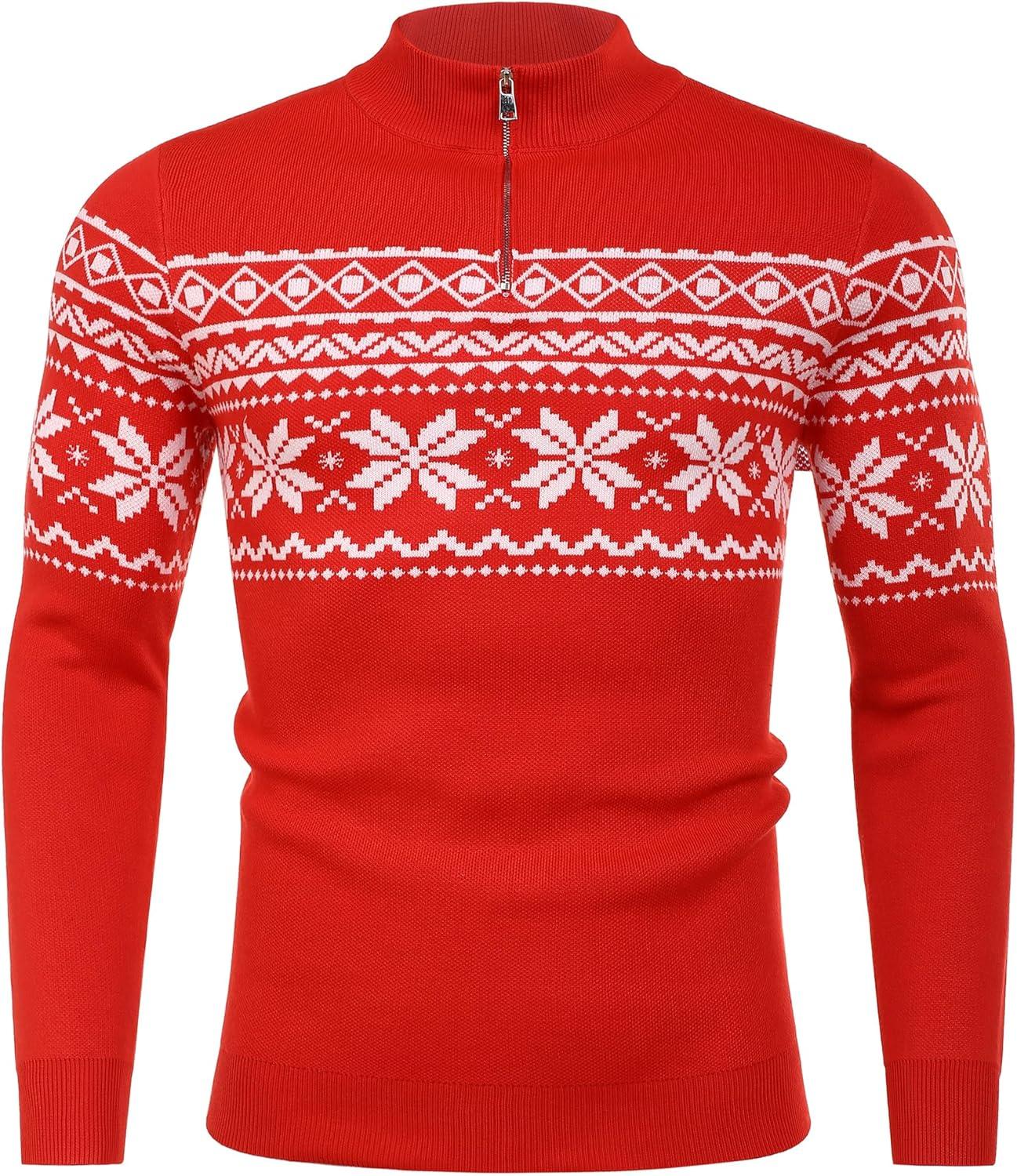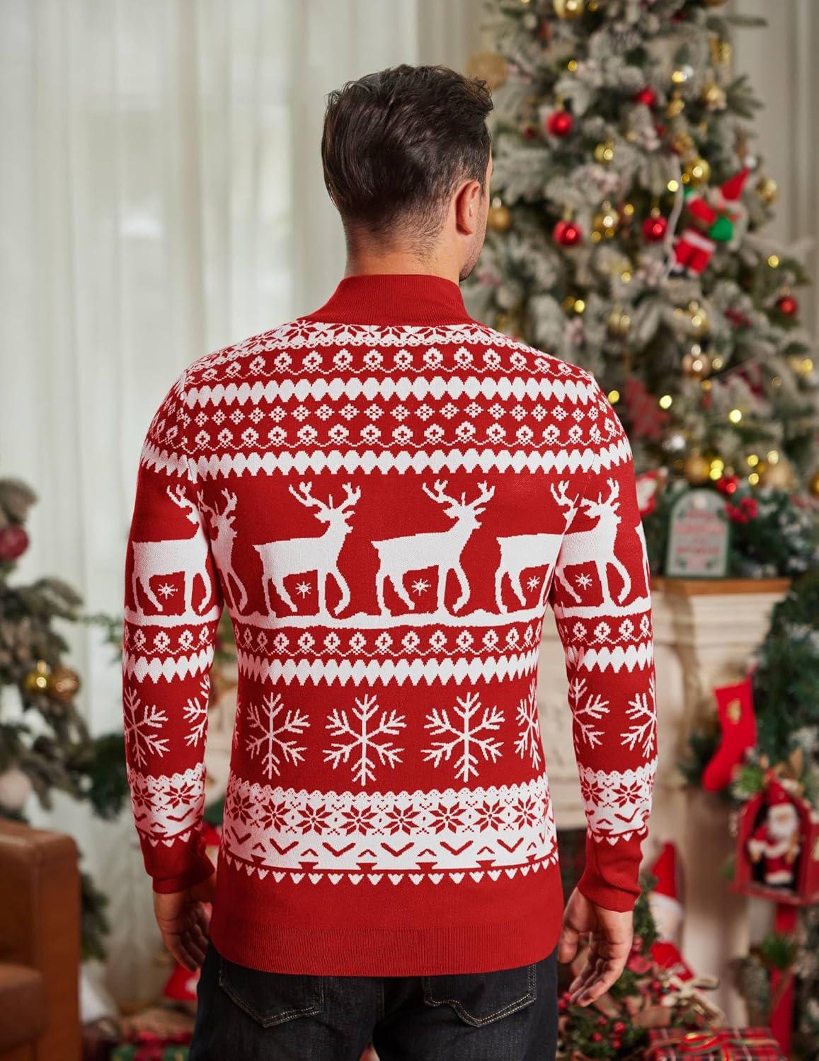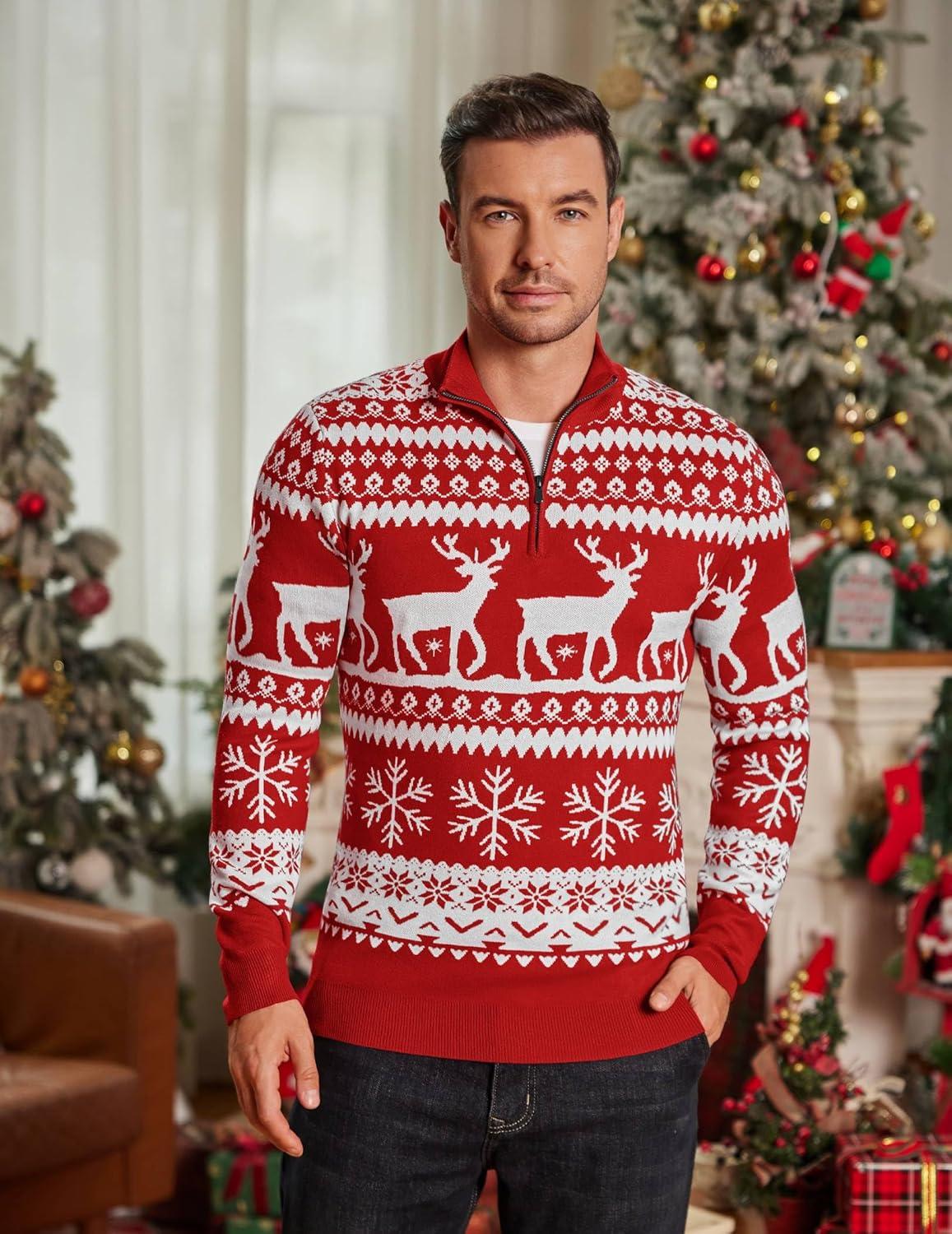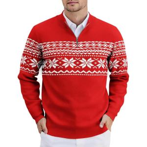 COOFANDY Men’s Quarter Zip Up Sweaters Slim Fit Lightweight Mock Neck Pullover Casual Polo Sweaters(Christmas Red & Elk)